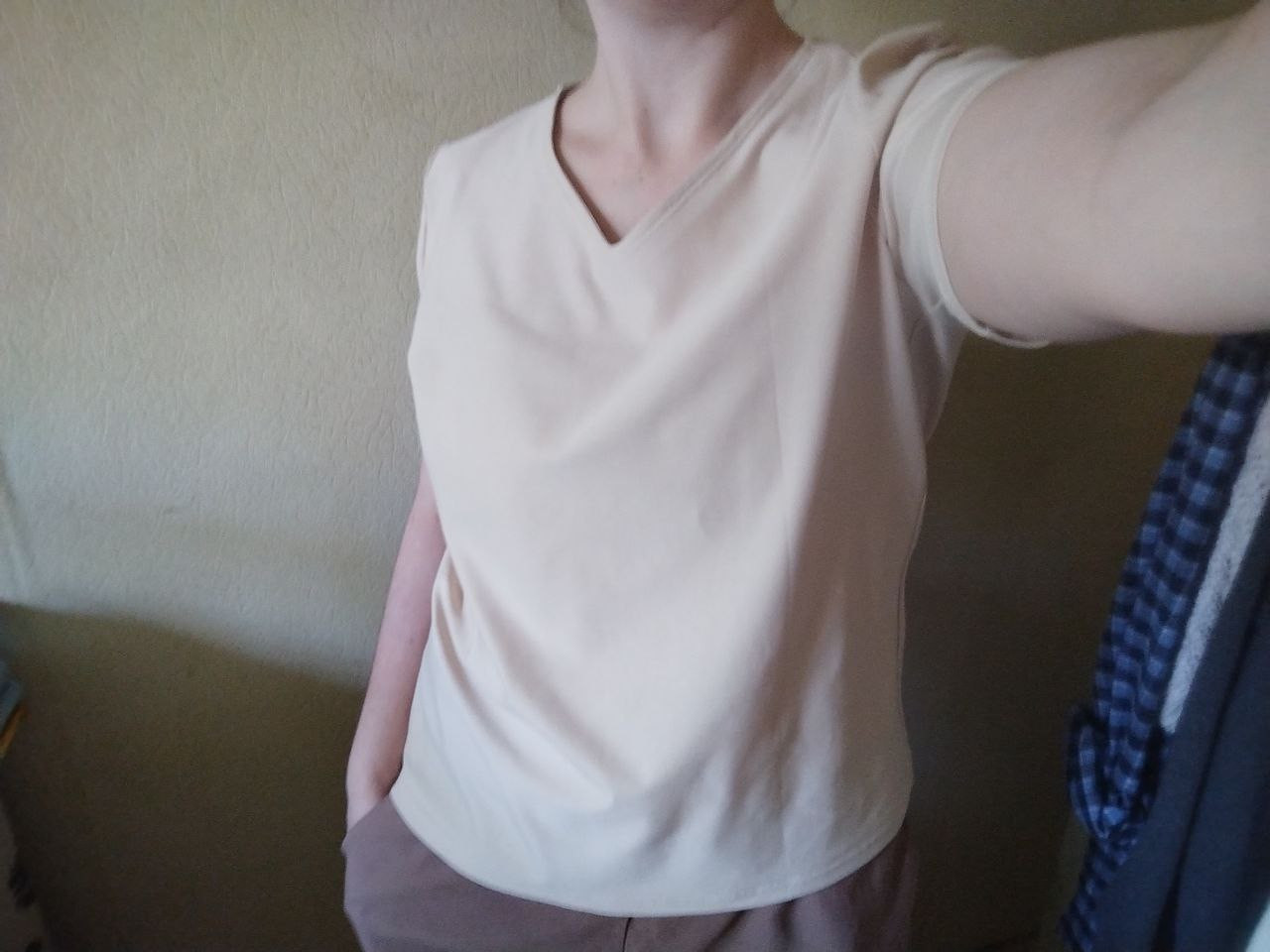 Футболка женская умеренного объёма, прямого силуэта. Без застёжки, с V-образной горловиной, обработанной обтачкой. С короткими рукавами.