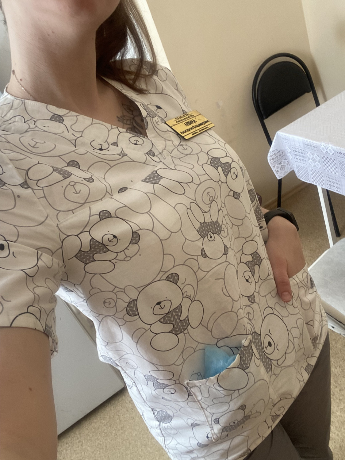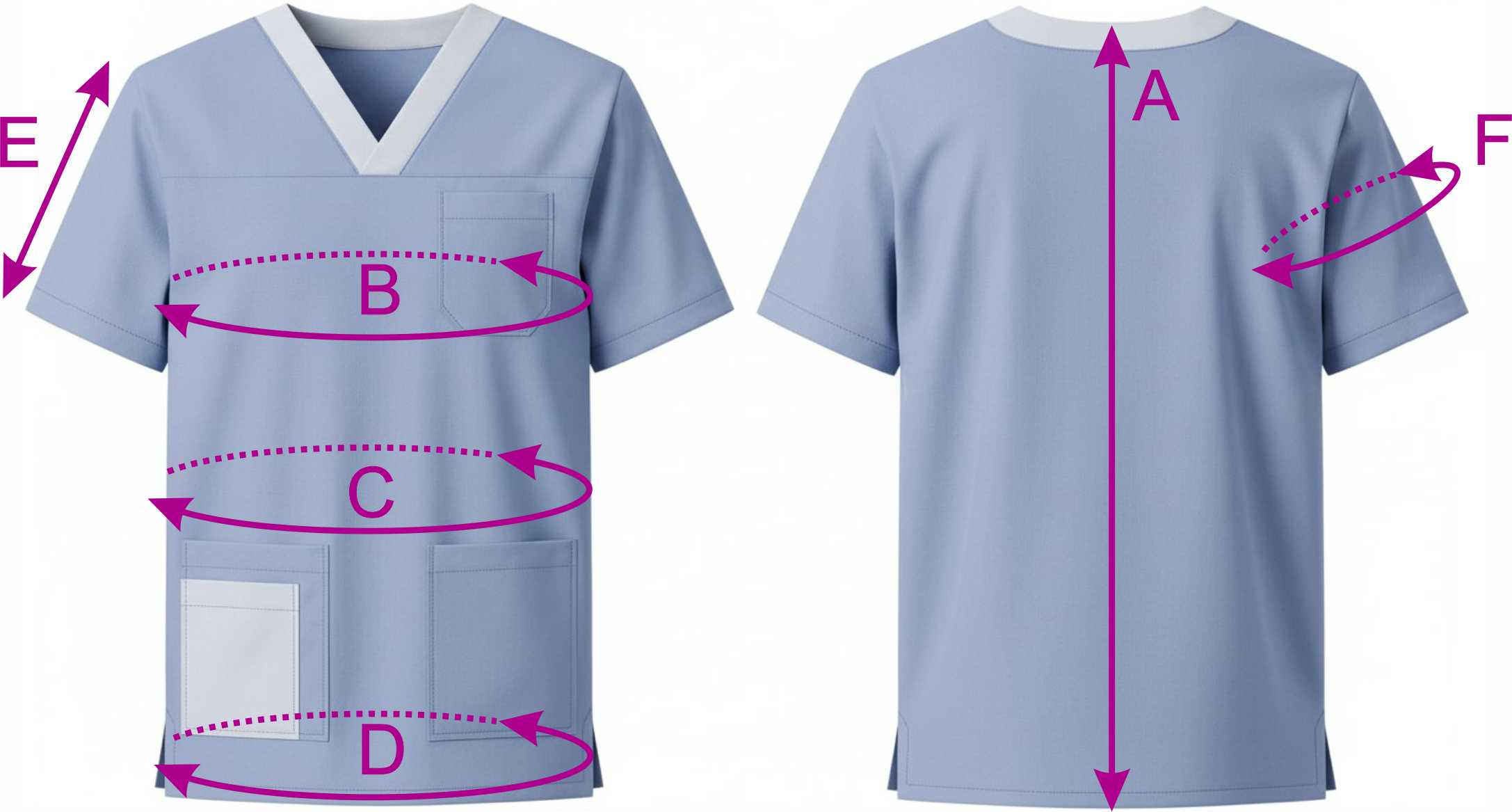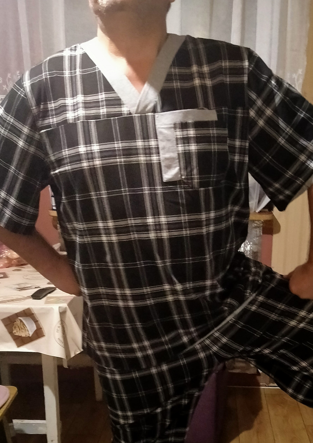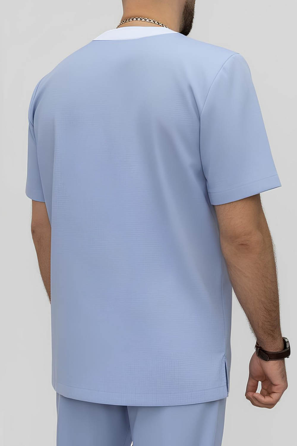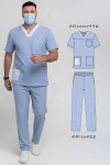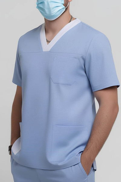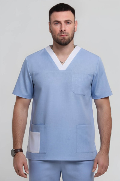 4Выкройка мужской медицинской рубашки умеренного объёма, прямого силуэта, изготовленной из основного материала двух цветов. Детали переда - с кокетками, нагрудным накладным карманом (слева) и боковыми накладными карманами. Правый боковой накладной карман дополнен ещё одним накладным карманом меньшего размера, из ткани контрастного цвета. Спинка - цельная. Горловина V-образной формы, обработана контрастной подкройной обтачкой с нахлёстом по центру горловины переда. Рукава - втачные, короткие.