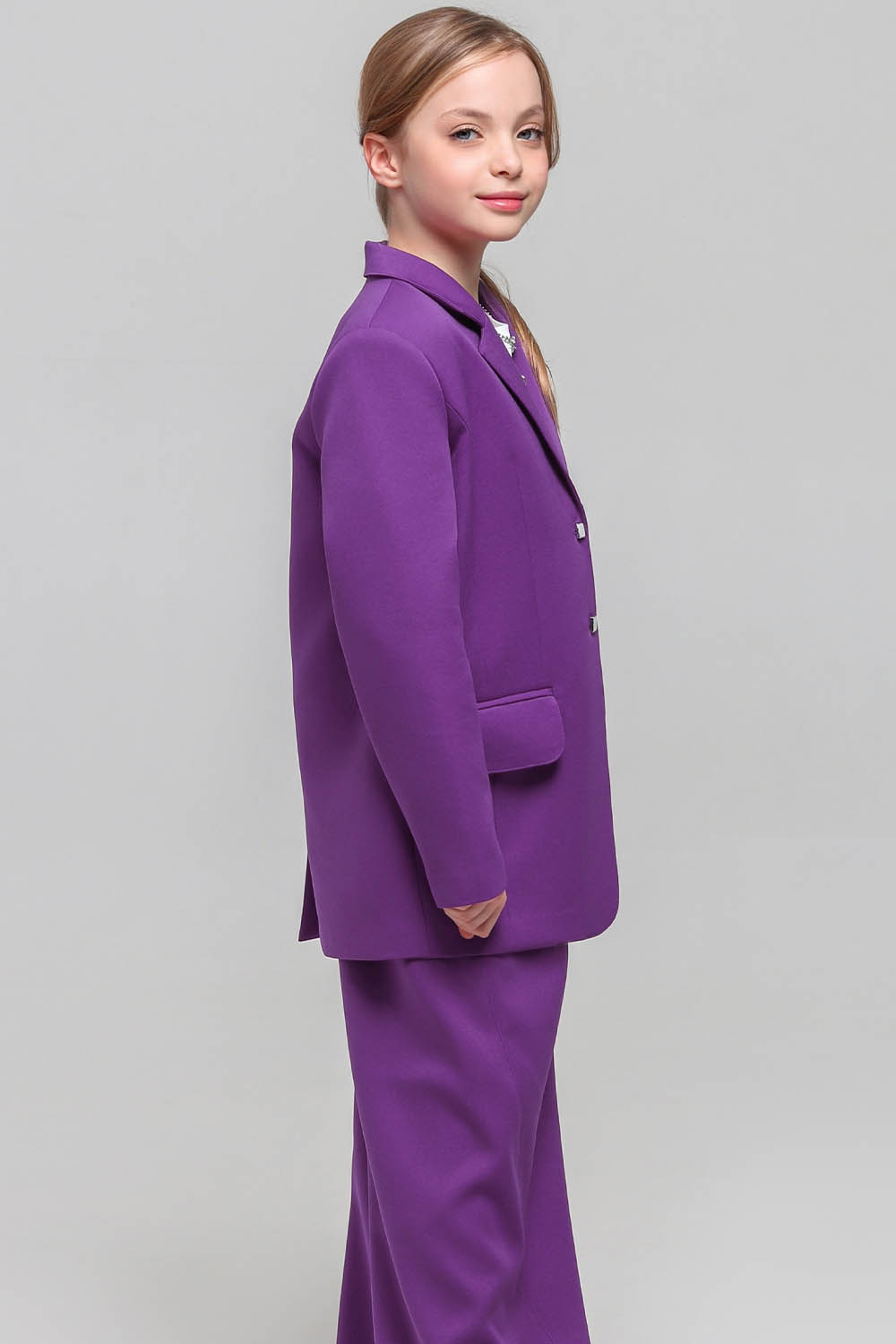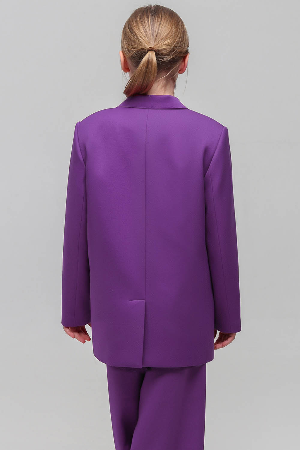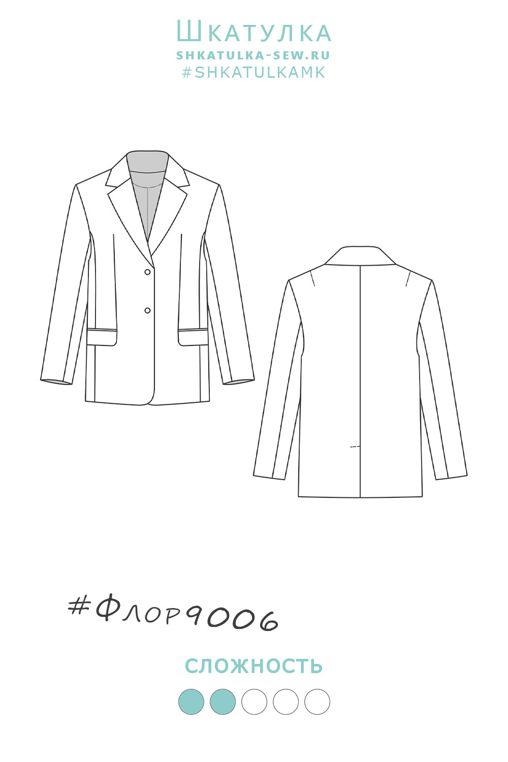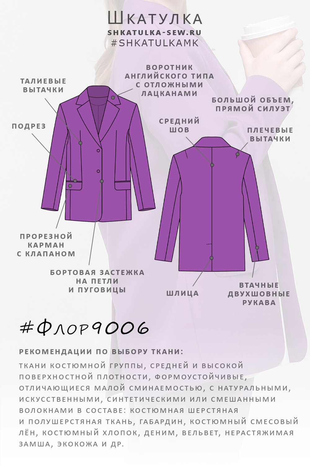 4Выкройка оверсайз-жакета для девочки, прямого силуэта, большого объема, выполненного на подкладке. Перед состоит из центральной части и бочка. Центральная часть - с талиевой вытачкой и подрезом. В подрезе обработан прорезной карман с клапаном и обтачками, переходящий на бочок. Спинка - со средним швом и плечевыми вытачками. По низу среднего шва спинки предусмотрена шлица. Горловина жакета оформлена воротником английского типа с отложными лацканами. Застёжка - центральная, бортовая, на 2 обмётанных петли и пуговицы. Рукава - втачные, двухшовные, длинные. Длина жакета - до середины бедра.