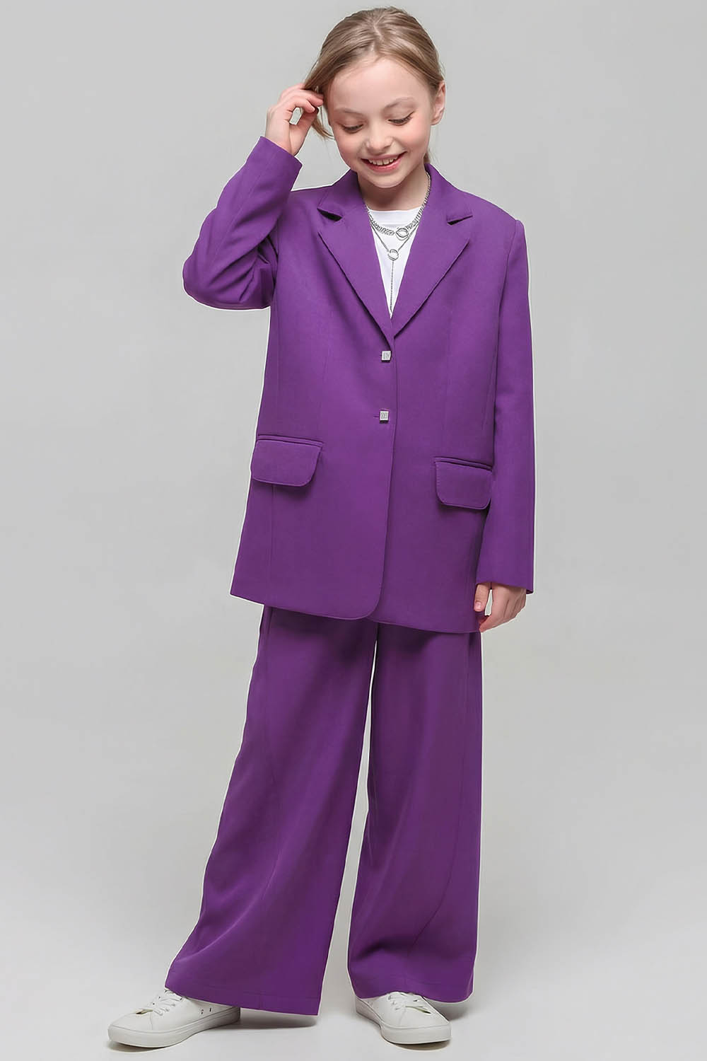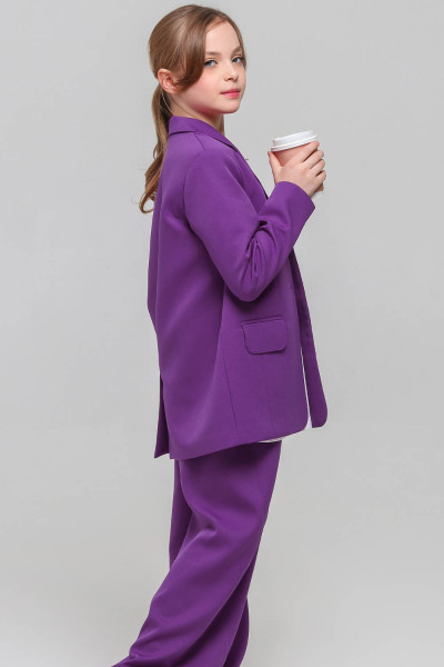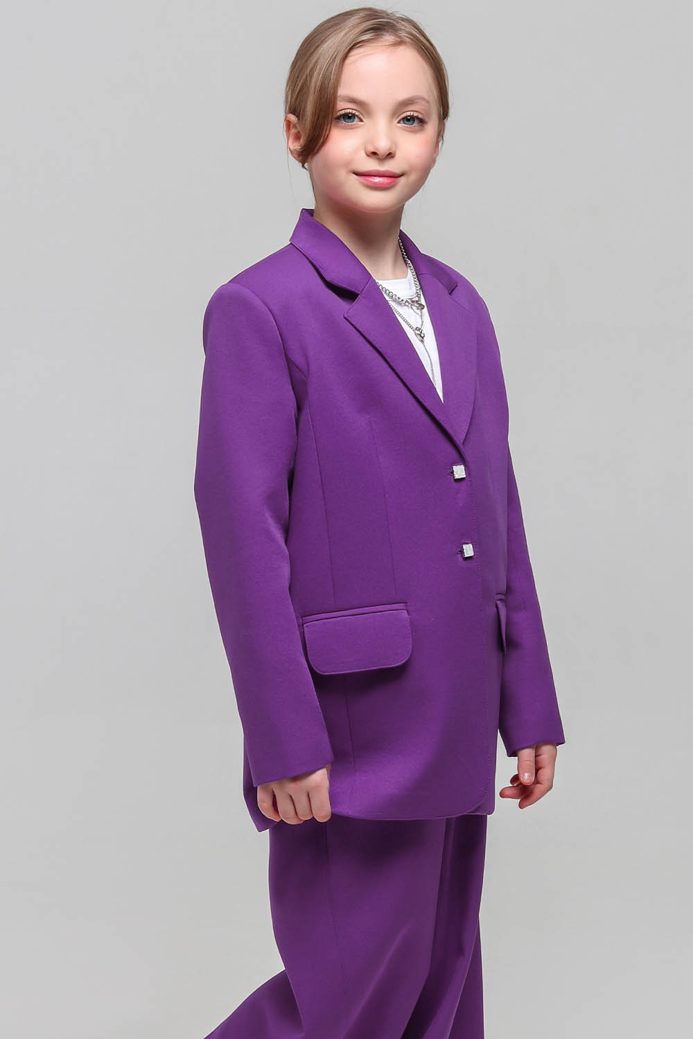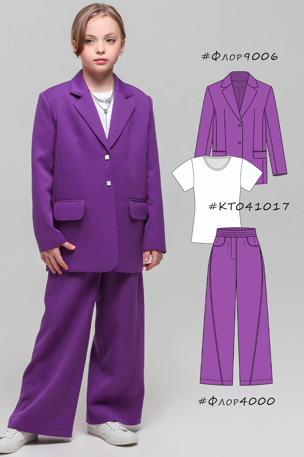 4Выкройка оверсайз-жакета для девочки, прямого силуэта, большого объема, выполненного на подкладке. Перед состоит из центральной части и бочка. Центральная часть - с талиевой вытачкой и подрезом. В подрезе обработан прорезной карман с клапаном и обтачками, переходящий на бочок. Спинка - со средним швом и плечевыми вытачками. По низу среднего шва спинки предусмотрена шлица. Горловина жакета оформлена воротником английского типа с отложными лацканами. Застёжка - центральная, бортовая, на 2 обмётанных петли и пуговицы. Рукава - втачные, двухшовные, длинные. Длина жакета - до середины бедра.