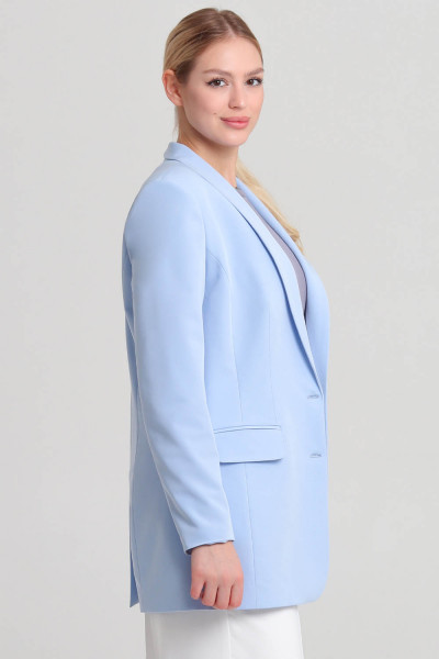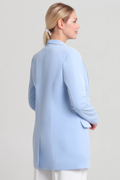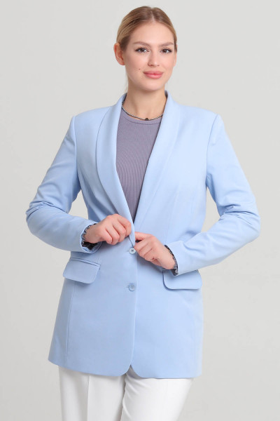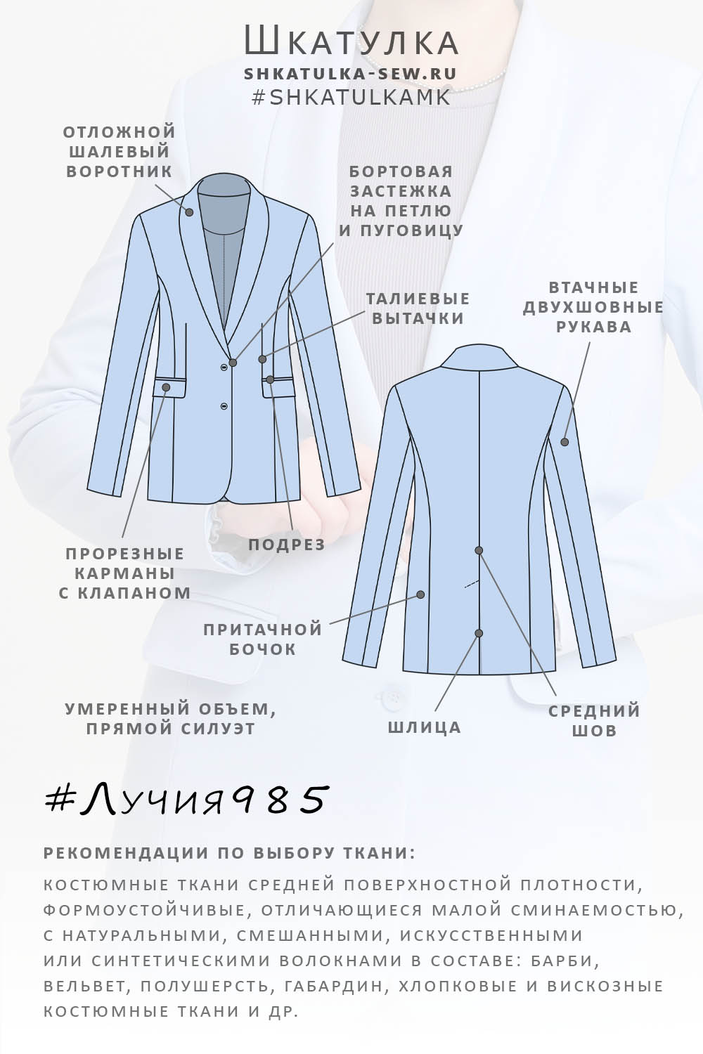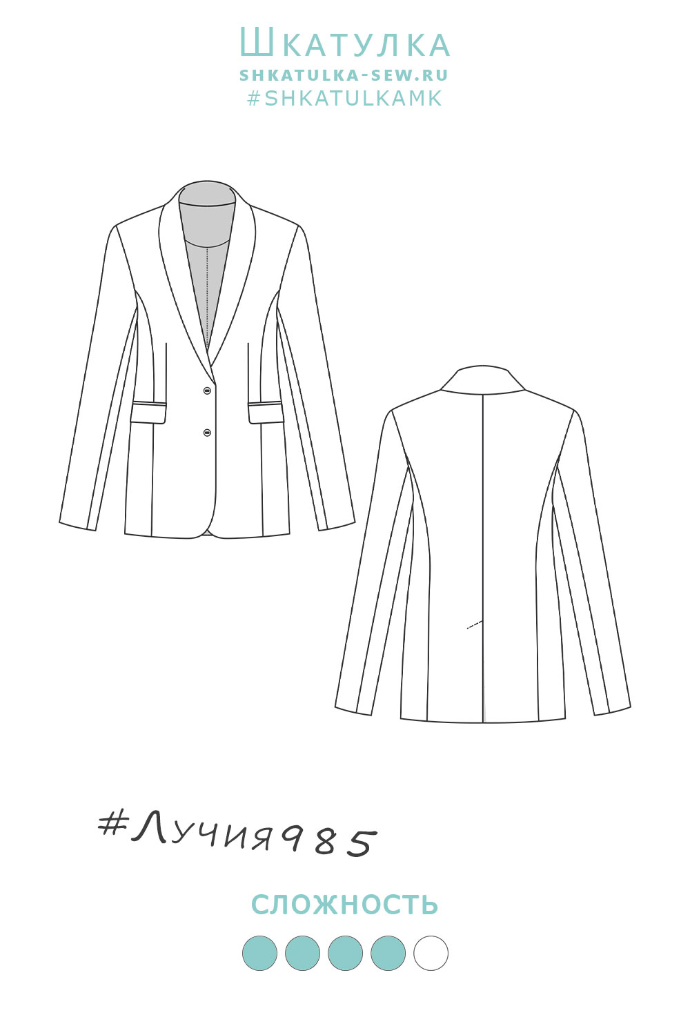 4Выкройка женского жакета прямого силуэта, умеренного объёма, на подкладке. Перед — с талиевыми вытачками и подрезом, с притачным бочком. В подрезе переда обработаны боковые прорезные карманы с клапаном. Спинка — со средним швом, со шлицей по низу среднего шва. Воротник — отложной, шалевый. Застёжка центральная бортовая, на обмётанную петлю и пуговицу. Рукава — втачные, двухшовные, длинные.