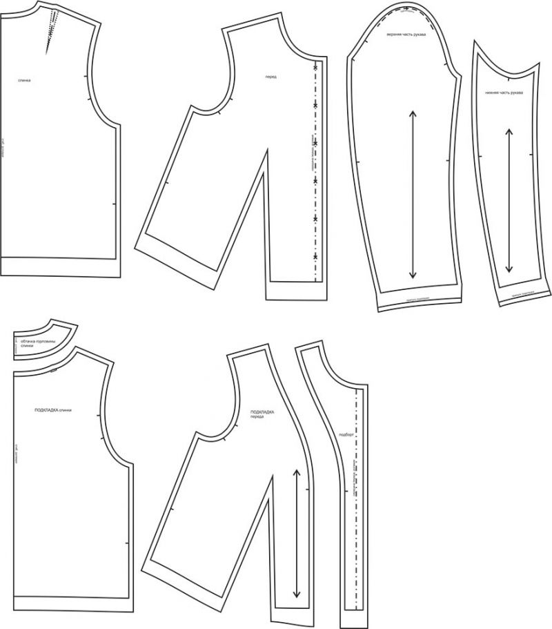 4Выкройка женского жакета умеренного объёма, прямого силуэта, выполненного на подкладке. Перед - с талиевыми вытачками. Спинка - с плечевыми вытачками. Горловина жакета - круглой формы, обработана подкройной обтачкой и подбортами. Застёжка - центральная, бортовая, на обмётанные петли и пуговицы. Рукава - втачные, двухшовные, длинные.