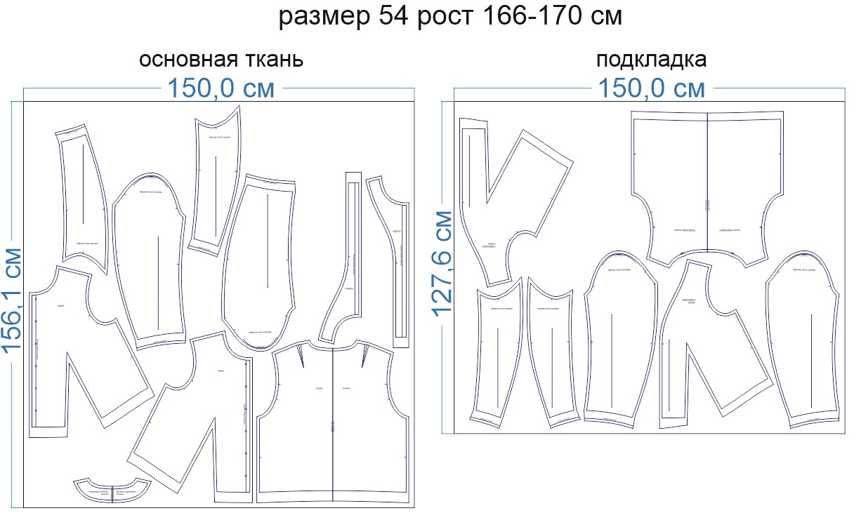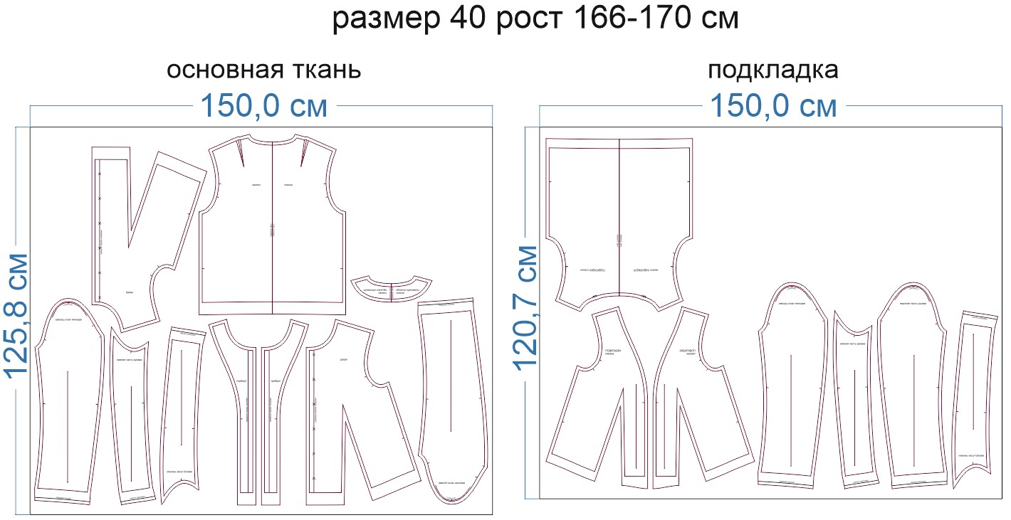 Образцы раскладки на ткани для выборочных размеров (расчет выполнен для однотонной ткани без учета направления ворса):