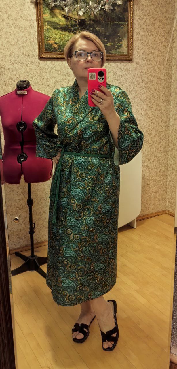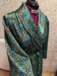 Халат женский прямого силуэта, умеренного объёма, с отложным шалевым воротником, завязывающийся на съёмный пояс, длиной до щиколотки.