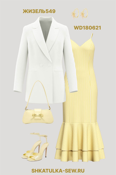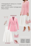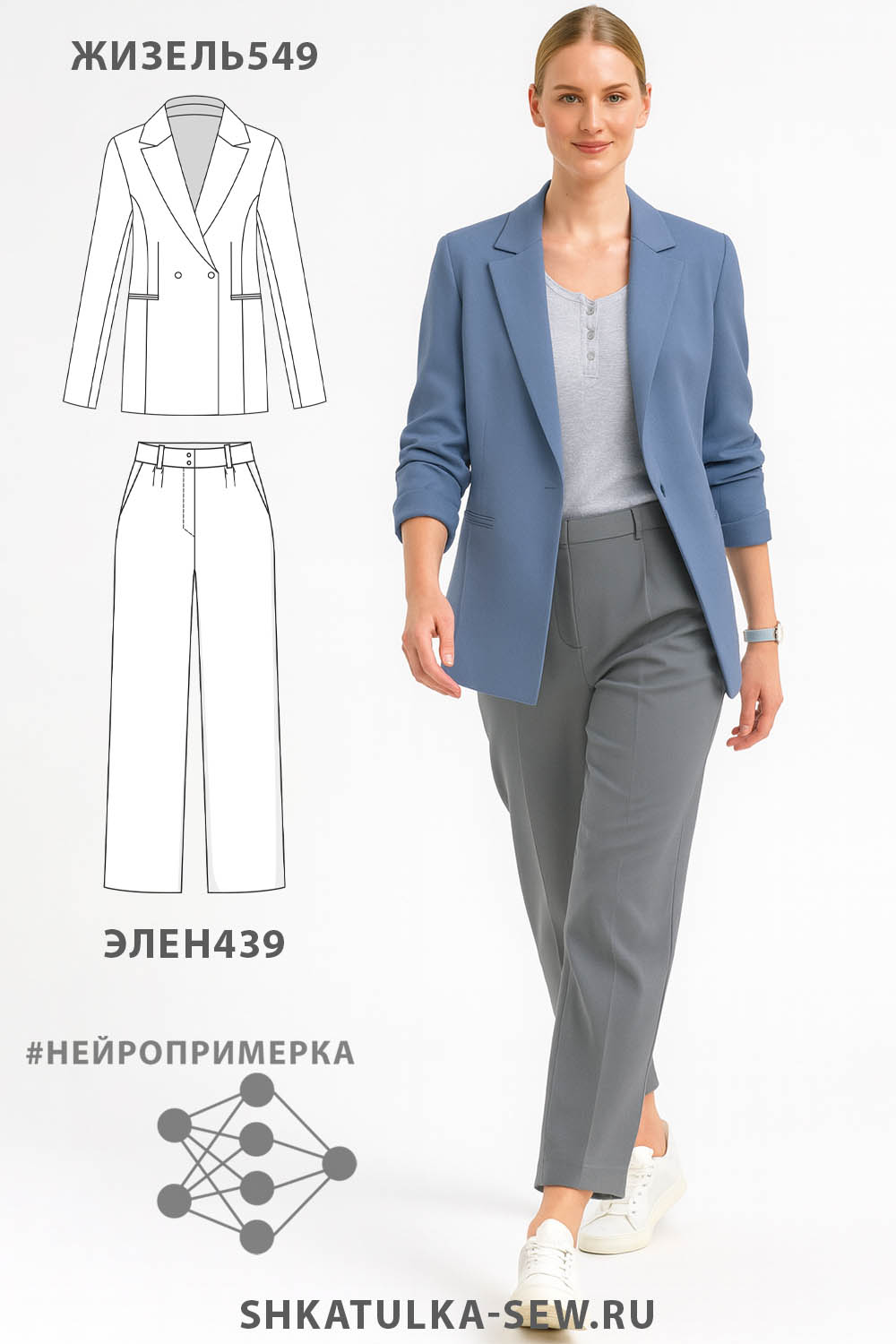 4Выкройка женского жакета среднего объёма, полуприлегающего силуэта, выполненного на подкладке. Перед — с талиевыми вытачками, с прорезными карманами в рамку, обработанными в горизонтальных подрезах. Бочки жакета цельные, переходящие с переда на спинку. Спинка — со средним швом и шлицей по низу среднего шва. Застёжка — двубортная, на 2 обмётанные петли и пуговицы. Воротник — отложной, английский, с притачной стойкой, с лацканами. Рукава — втачные, двухшовные, длинные, среднего объёма. Длина жакета — до середины бедра.