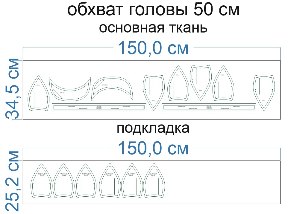 Выкройка детской/ взрослой кепки, среднего объёма, выполненной на подкладке.