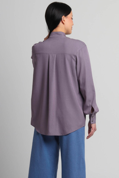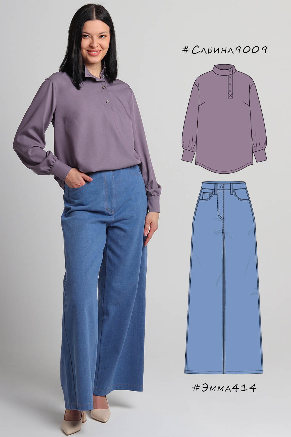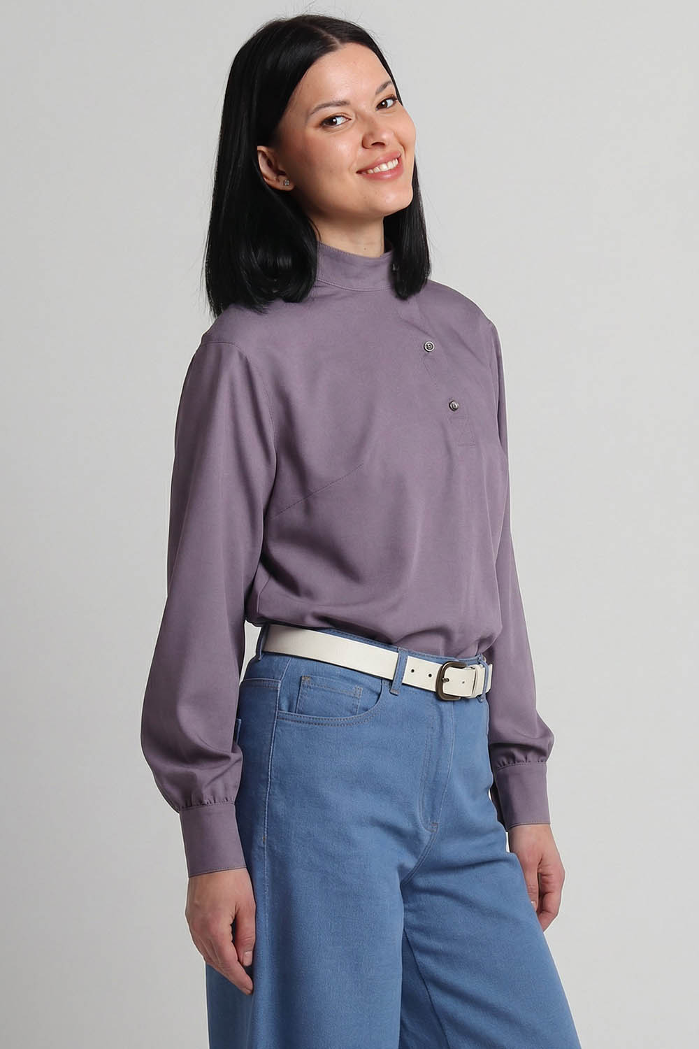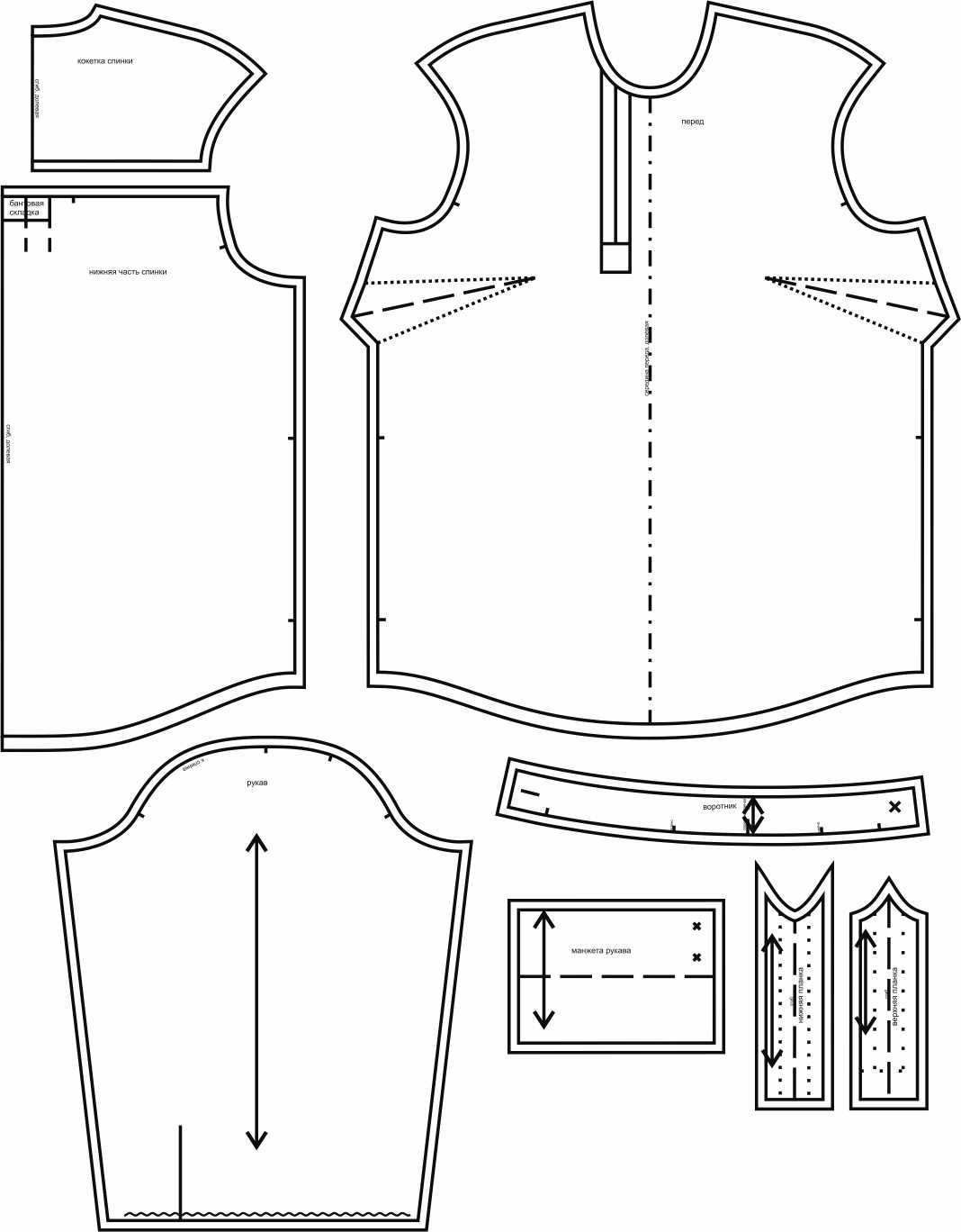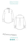 4Выкройка женской косоворотки среднего объёма, прямого силуэта, со спущенной линией плеча. Перед - с нагрудными вытачками, выходящими из боковых швов. Спинка - на кокетке, со складкой по шву притачивания кокетки. Горловина обработана воротником-стойкой. Застёжка - смещённые относительно центра втачные планки длиной до линии груди, а также обмётанные петли и пуговицы на воротнике и планках. Рукава - рубашечного покроя, длинные, со сборкой и разрезом по низу, на притачной застёгивающейся манжете. Длина косоворотки - до линии бёдер. Форма низа - фигурная, скруглённая от центра переда и центра спинки к боковым швам.