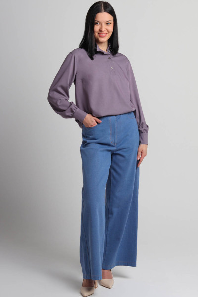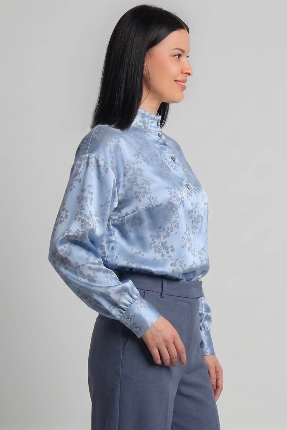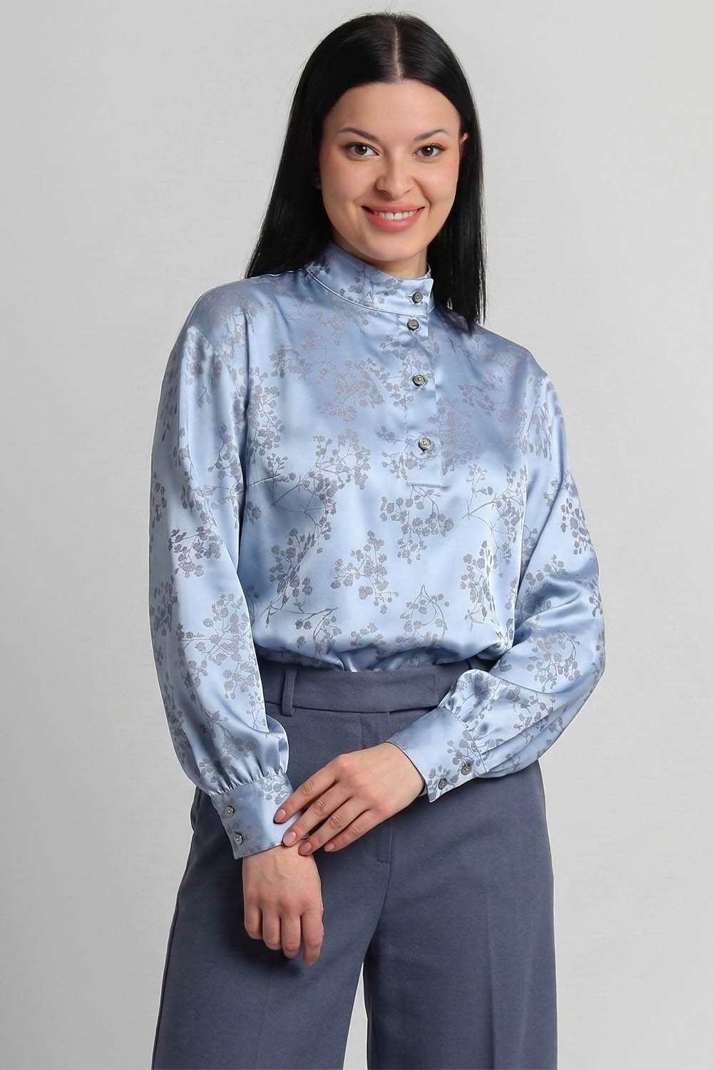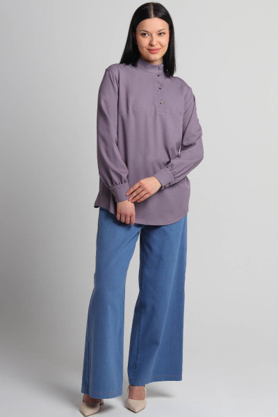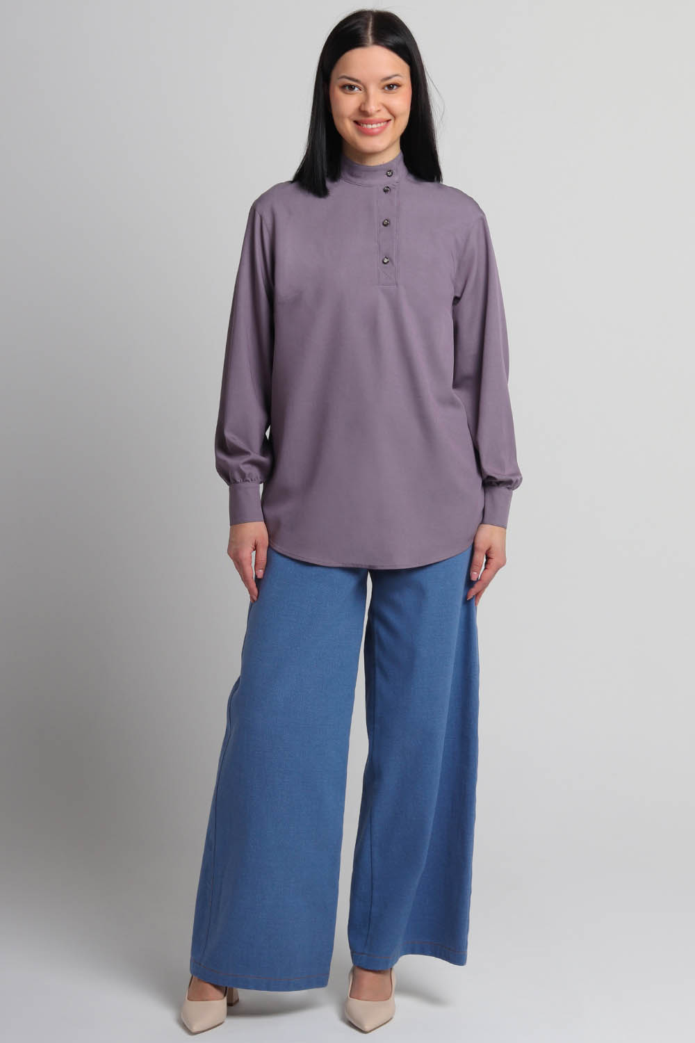 4Выкройка женской косоворотки среднего объёма, прямого силуэта, со спущенной линией плеча. Перед - с нагрудными вытачками, выходящими из боковых швов. Спинка - на кокетке, со складкой по шву притачивания кокетки. Горловина обработана воротником-стойкой. Застёжка - смещённые относительно центра втачные планки длиной до линии груди, а также обмётанные петли и пуговицы на воротнике и планках. Рукава - рубашечного покроя, длинные, со сборкой и разрезом по низу, на притачной застёгивающейся манжете. Длина косоворотки - до линии бёдер. Форма низа - фигурная, скруглённая от центра переда и центра спинки к боковым швам.