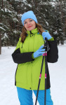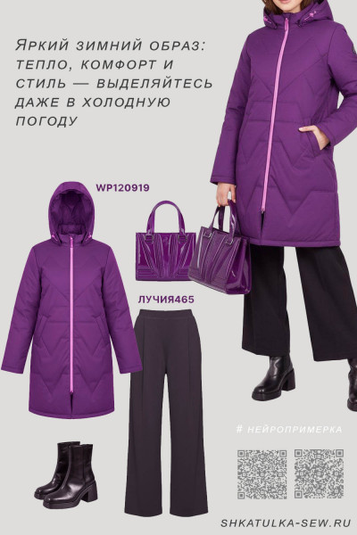Выкройка утеплённой женской куртки среднего объёма, прямого силуэта, рассчитанной на демисезонный утеплитель. Перед — с фигурными кокетками, с боковыми прорезными карманами с листочками. Спинка — цельная, без конструктивных особенностей. Детали переда и спинки оформлены фигурной стёжкой. Застёжка — центральная, на разъёмную молнию и внутреннюю ветрозащитную планку. Горловина куртки оформлена воротником-стойкой и съёмным двухшовным капюшоном с кулиской. Рукава — втачные, длинные. Длина куртки — выше колена.