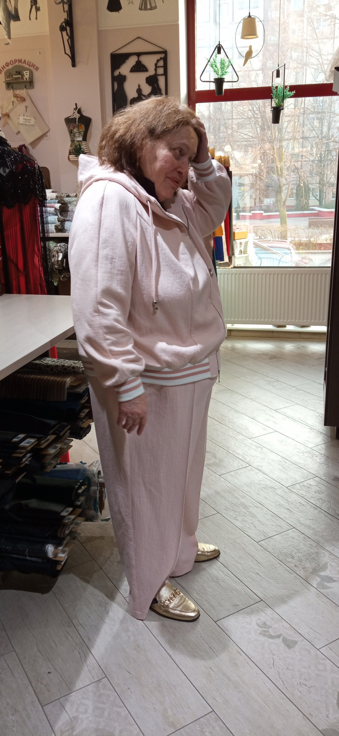 Образец сшит из трикотажа футер 3-нитка с начесом. Пояс и манжеты выполнены из трикотажа кашкорсе.