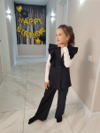 4Выкройка детского жилета среднего объёма, полуприлегающего силуэта. Перед и спинка — с вертикальными рельефами, выходящими из плечевых швов. В верхней части изделия предусмотрены воланы-крылышки, втачанные в рельефы и переходящие с переда на спинку. Горловина жилета оформлена отложным воротником английского типа с лацканами. Застёжка — центральная, бортовая, на обмётанные петли и пуговицы. Проймы жилета обработаны подкройными обтачками. Форма низа деталей переда — фигурная. Длина жилета — ниже линии бёдер, по переду длиннее, по спинке — короче. В качестве дополнения к жилету предусмотрен съёмный пояс с полукольцами, позволяющий регулировать степень прилегания изделия по фигуре в области талии.