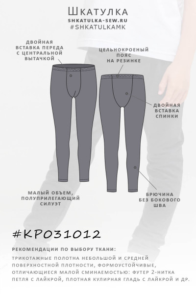 DESCRIPTION_LONG Выкройка детских трикотажных кальсон малого объёма, полуприлегающего силуэта. Кальсоны состоят из двойной передней части, двойной задней части и штанин. Верхний срез изделия обработан цельнокроеным поясом на резинке.