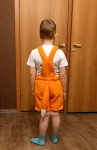 Выкройка детского полукомбинезона среднего объёма, полуприлегающего силуэта. Передняя часть полукомбинезона состоит из переда, выполненного на подкладке, с накладным карманом с клапаном, притачного пояса и передних половинок шорт с боковыми карманами с подрезным бочком. Задняя часть полукомбинезона состоит из спинки, выполненной на подкладке, с бретелями на кнопках, притачного пояса и задних половинок шорт. Застёжка шорт обработана в боковых швах (гульфики на кнопках) и на поясе (кнопки). Длина брючин — до середины бедра.