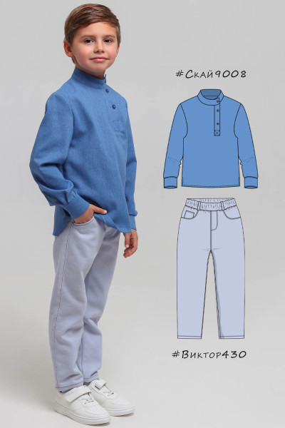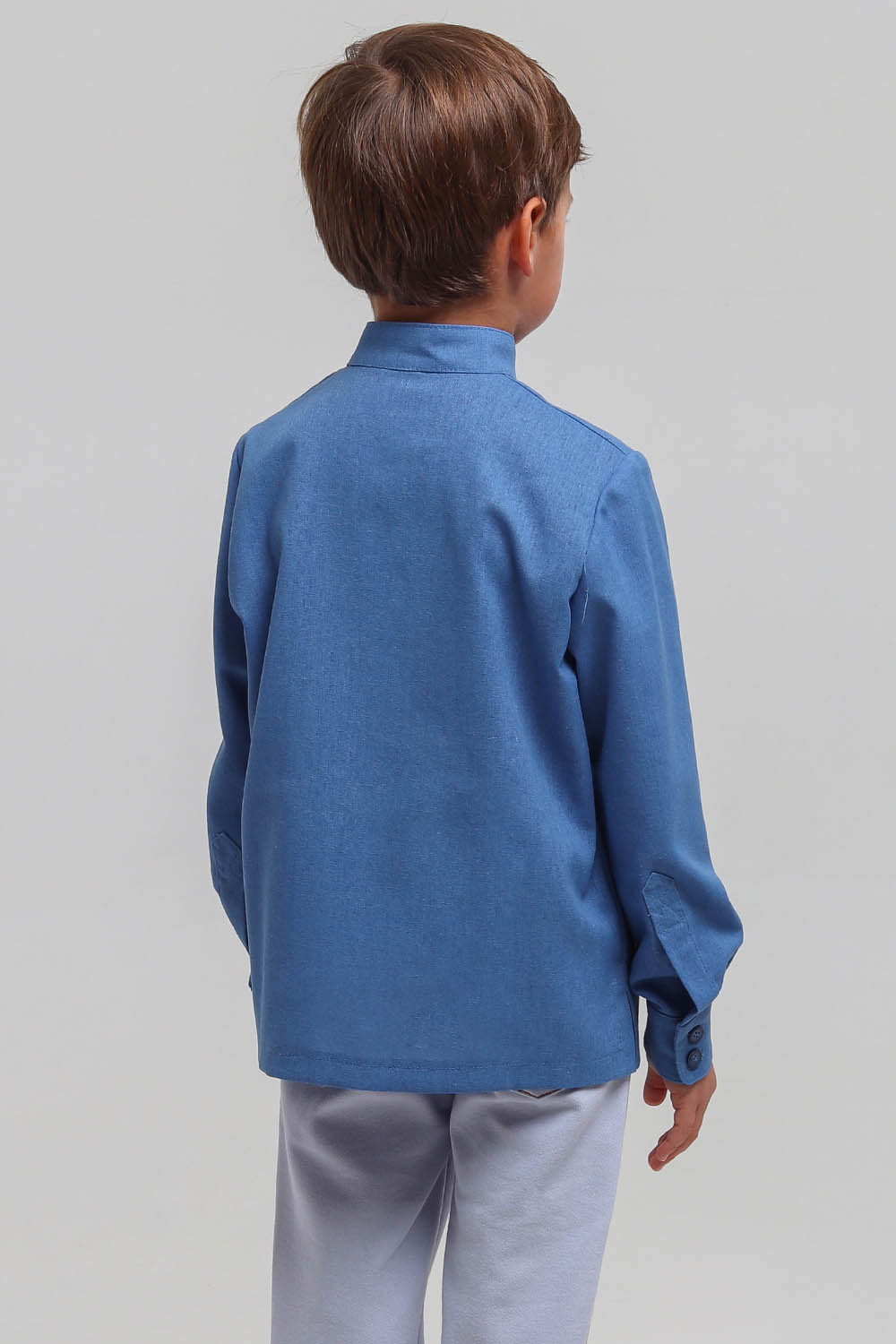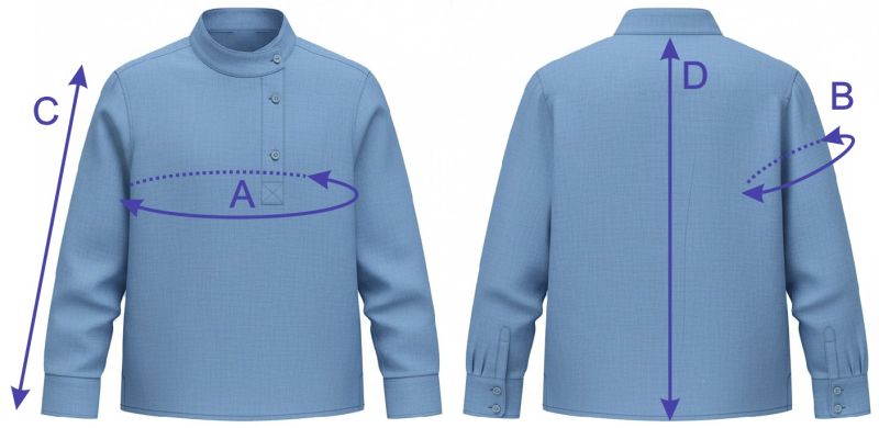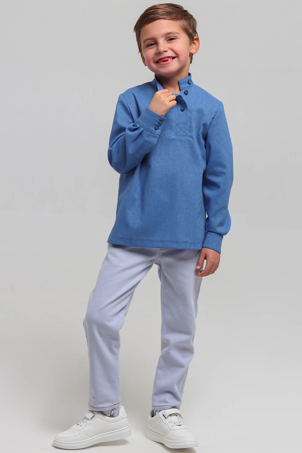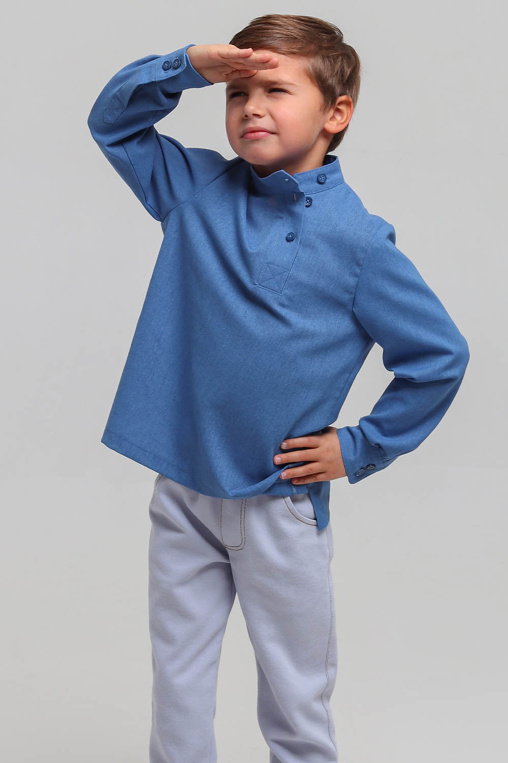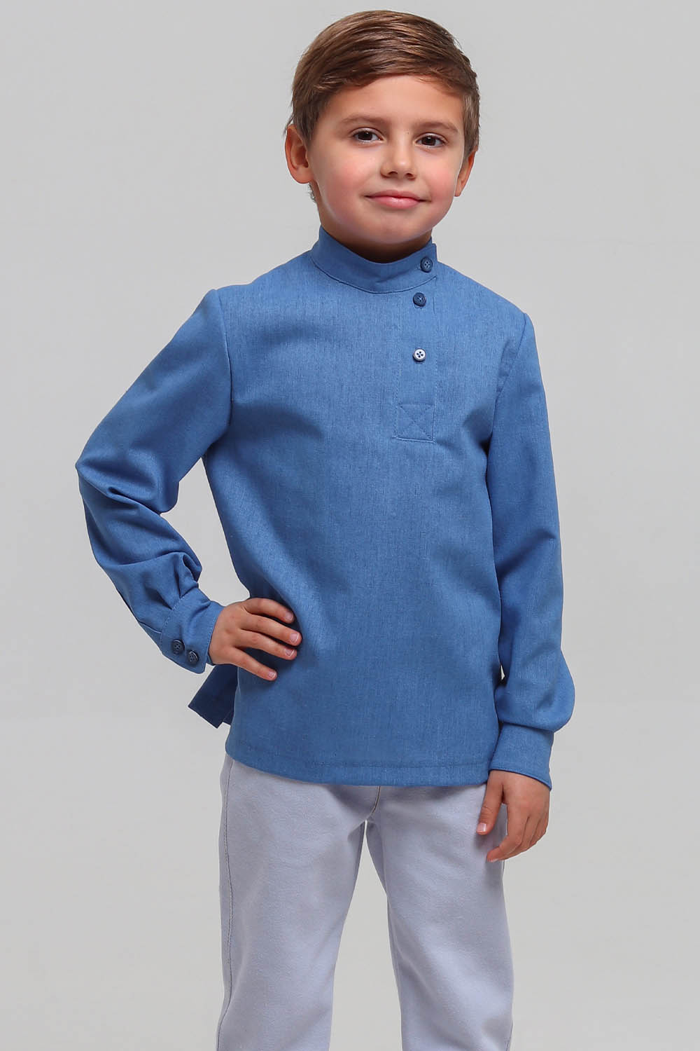 4Выкройка детской косоворотки среднего объёма, прямого силуэта. Перед и спинка - цельные, без формообразующих конструктивных элементов. Горловина оформлена воротником-стойкой.