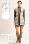 4Выкройка женского жилета прямого силуэта, умеренного объёма, на подкладке. Перед — с талиевыми вытачками и подрезом, с притачным бочком. В подрезе переда обработаны боковые прорезные карманы с клапаном. Спинка — со средним швом, с плечевыми вытачками, со шлицей по низу среднего шва. Воротник — отложной, шалевый. Застёжка центральная бортовая, на обмётанную петлю и пуговицу.