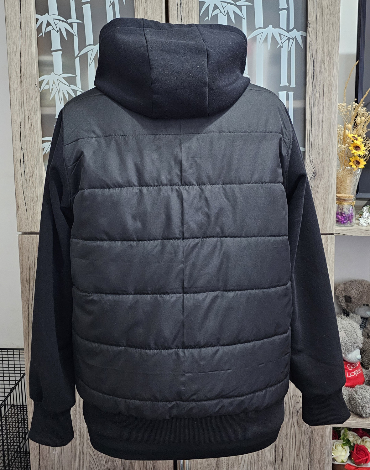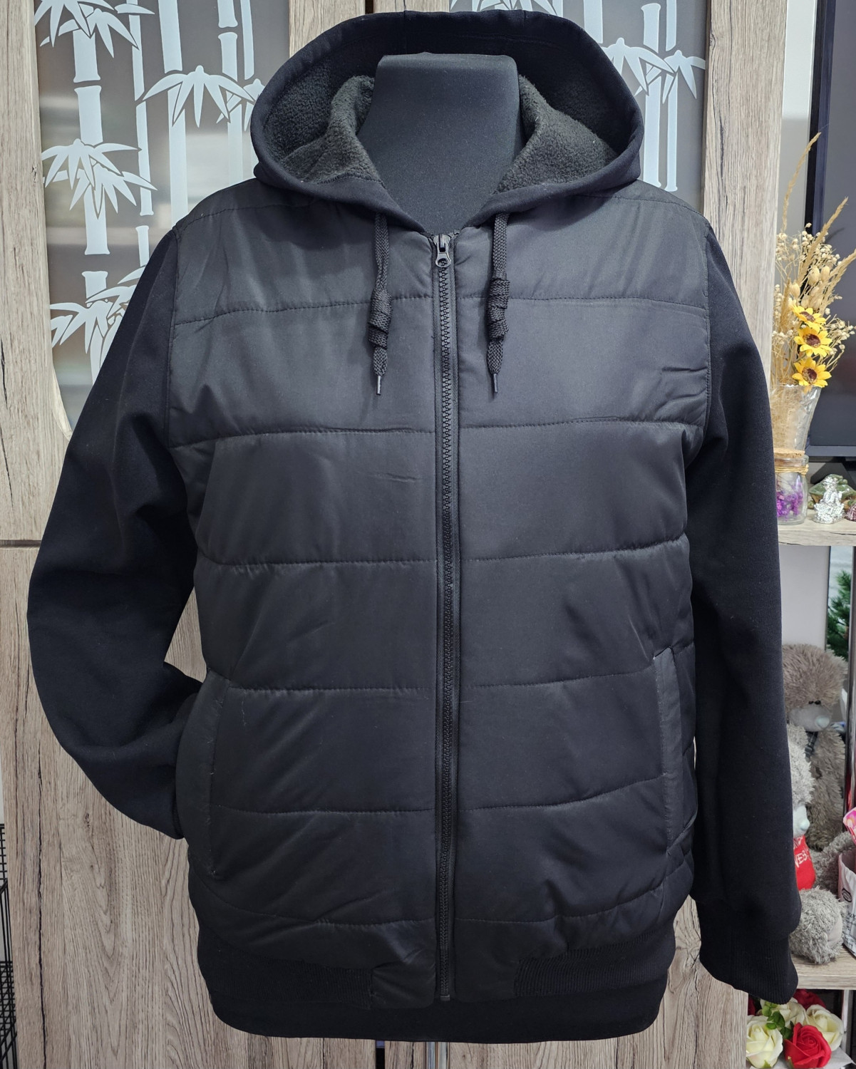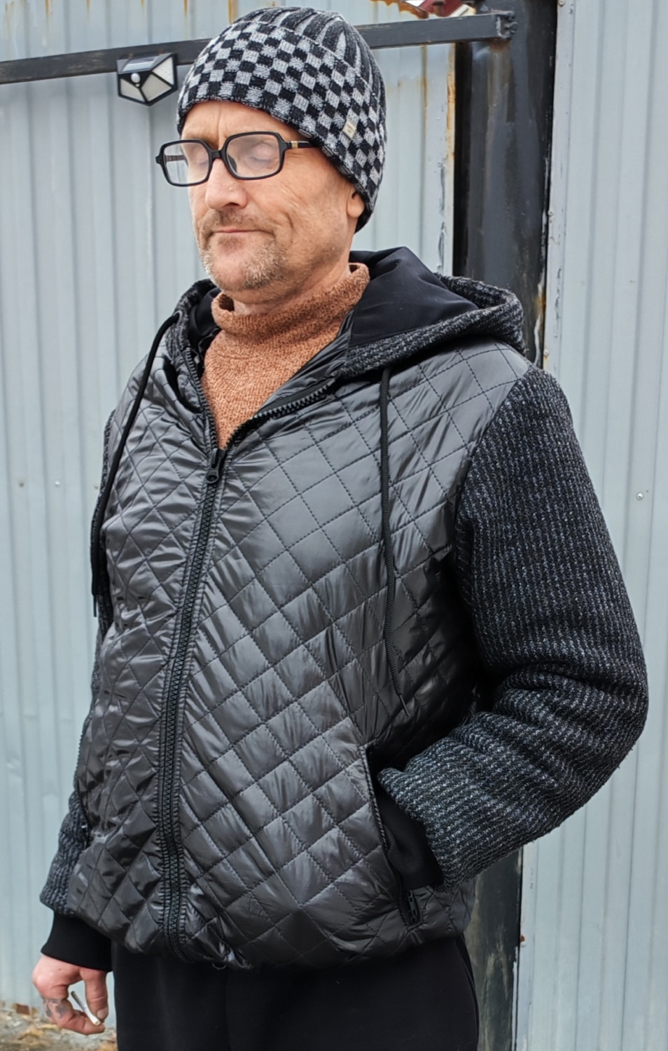Образец сшит из курточной ткани и трикотажа футер 3-нитка с начесом.