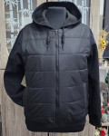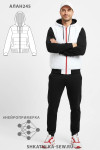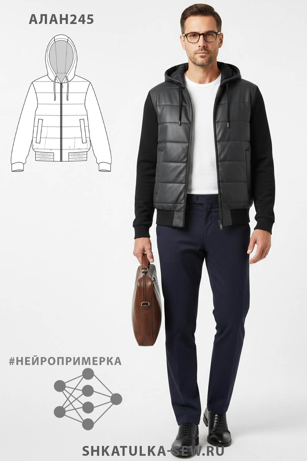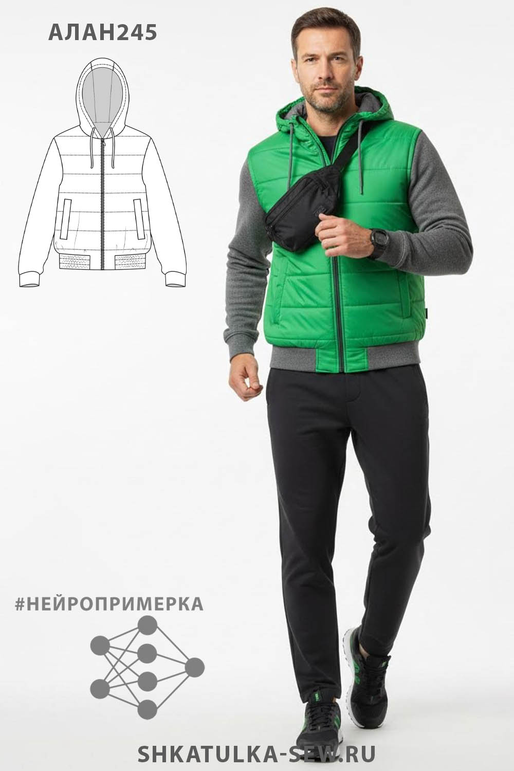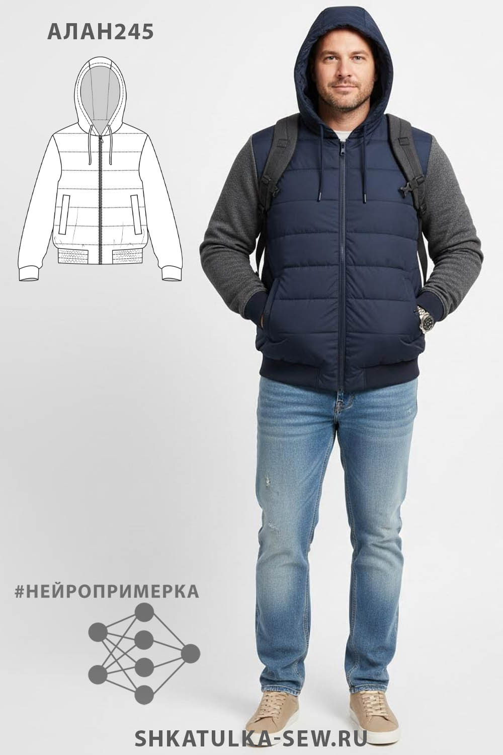 4Выкройка мужской комбинированной куртки умеренного объёма, прямого силуэта, выполненной из основного материала двух видов, частично на утеплителе и на подкладке. Детали переда выполнены из плащевой ткани, имеют горизонтальную стёжку на утеплителе и боковые прорезные карманы с листочками с втачными концами. Спинка также выполнена из плащевой ткани, простёгана горизонтальными линиями на утеплителе. Горловина куртки оформлена двухшовным капюшоном из трикотажа, с кулиской и шнуром. Застёжка - центральная, на разъёмную молнию и ветрозащитную планку. Рукава - втачные, выполнены из трикотажа, длиной до запястья, с притачной круговой трикотажной манжетой по низу. По низу переда и спинки предусмотрен втачной пояс из плащевой ткани, на резинке. Перед и спинка куртки выполнены на притачной подкладке.