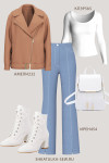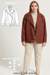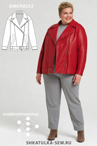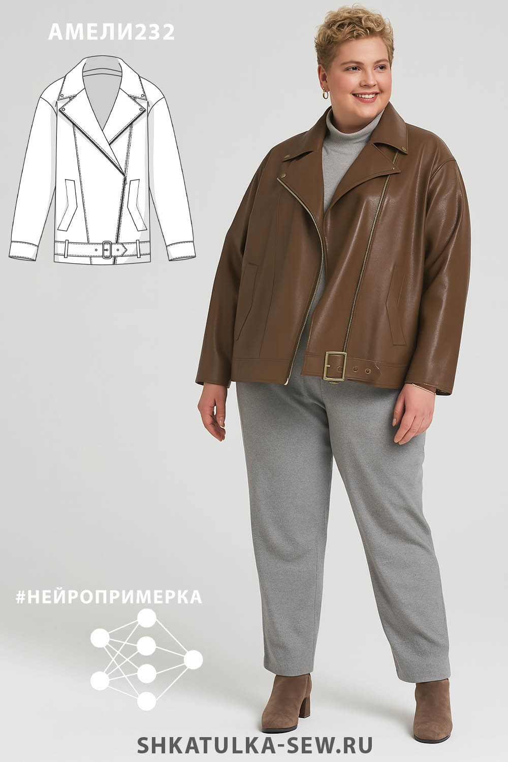 4Выкройка женской куртки-косухи среднего объёма, прямого силуэта, выполненной на подкладке. Перед — с вертикальными рельефами, выходящими из плечевых швов, с боковыми прорезными карманами с фигурными листочками. Спинка — с кокеткой и вертикальными рельефами, выходящими из шва притачивания кокетки. Горловина куртки обработана отложным воротником английского типа с лацканами. Застёжка — разъёмная молния, расположена асимметрично, одной стороной в шве обтачивания борта, другой — в рельефном шве переда.  Рукава — рубашечного покроя, двухшовные, с разрезом по низу локтевого шва и на притачной застёгивающейся манжете. По низу куртки расположены шлёвки и предусмотрен съёмный застёгивающийся пояс. Длина куртки — до середины бедра.