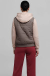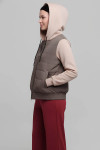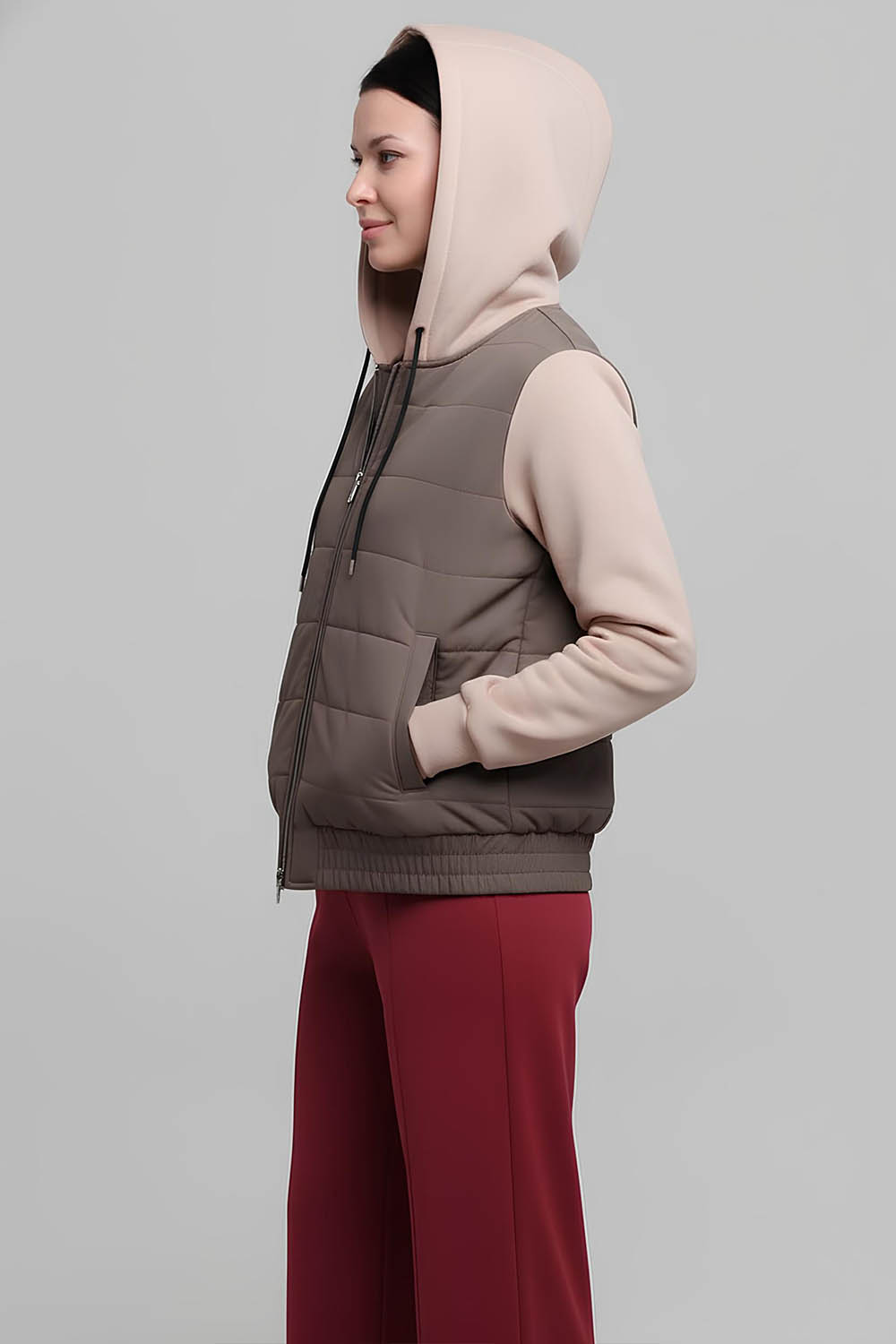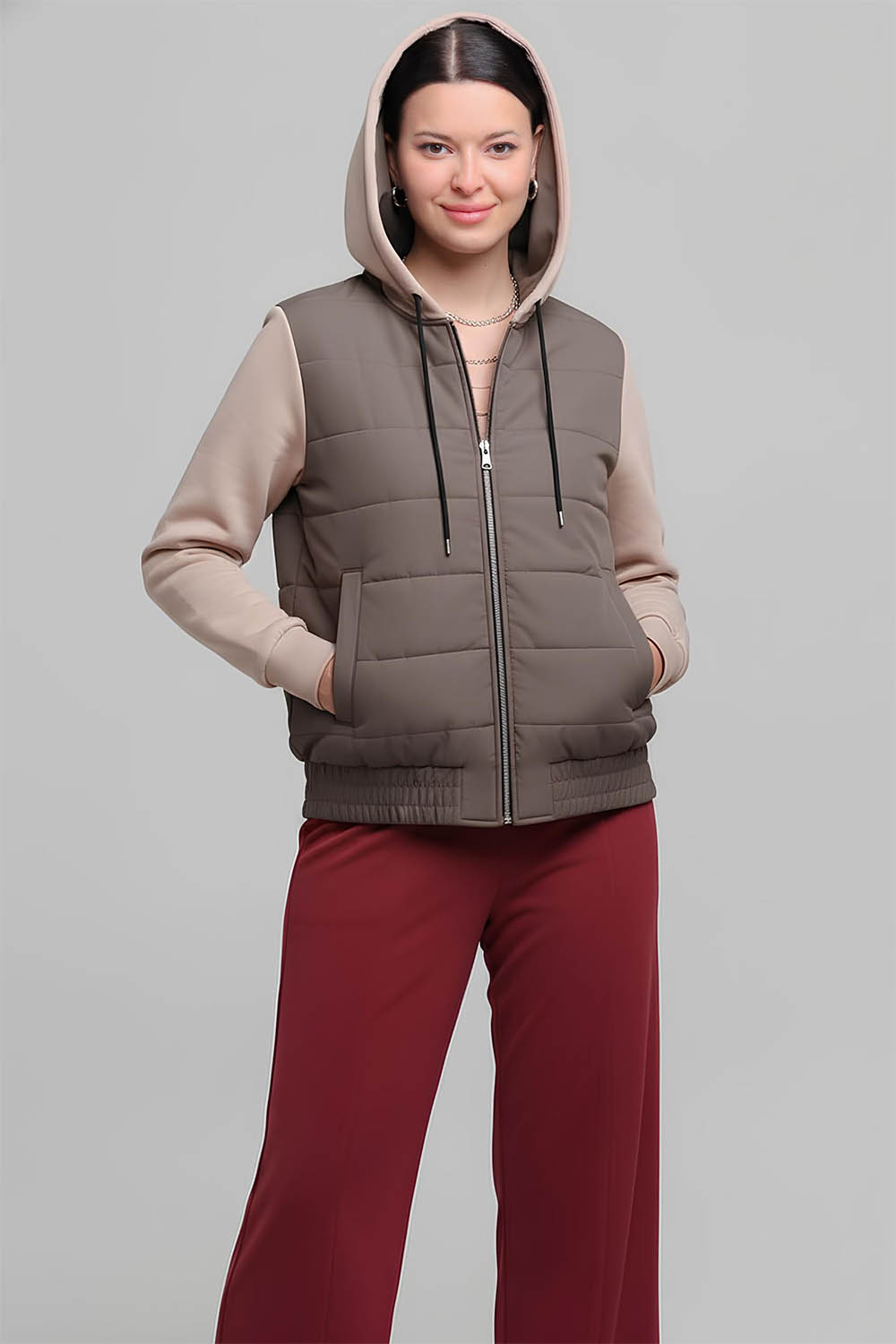 4Выкройка женской комбинированной куртки умеренного объёма, прямого силуэта, выполненной из основного материала двух видов, частично на утеплителе и на подкладке. Детали переда выполнены из плащевой ткани, имеют горизонтальную стёжку на утеплителе и боковые прорезные карманы с листочками с втачными концами. Спинка также выполнена из плащевой ткани, простёгана горизонтальными линиями на утеплителе. Горловина куртки оформлена двухшовным капюшоном из трикотажа, с кулиской и шнуром. Застёжка - центральная, на разъёмную молнию и ветрозащитную планку. Рукава - втачные, выполнены из трикотажа, длиной до запястья, с притачной круговой трикотажной манжетой по низу. По низу переда и спинки предусмотрен втачной пояс из плащевой ткани, на резинке. Перед и спинка куртки выполнены на притачной подкладке.
