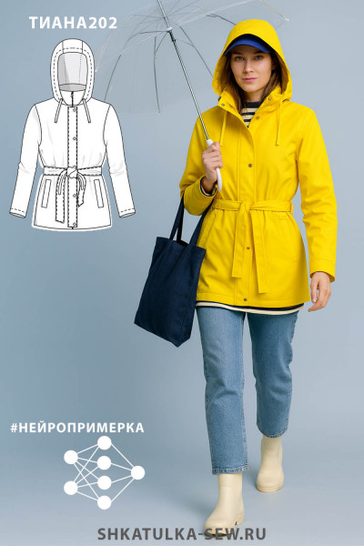 4Выкройка демисезонной женской куртки малого объема с высоким воротником-стойкой, капюшоном и навесным поясом. Длина до середины бедра. На полочке - застежка на длинную разъемную молнию, ветрозащитная планка и прорезные карманы с листочкой. Спинка без особенностей. Капюшон глубокий, двухшовный, укорочен спереди. При желании куртку можно сшить без капюшона,  оставив только воротник.