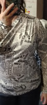4Выкройка женского трикотажного лонгслива малого объёма, прилегающего силуэта. Перед — с кокеткой на левом плече, с драпировкой на правом плече и по левому боковому шву. Спинка — цельная, без особенностей. Горловина лонгслива имеет ассиметричную V-образную форму, обработана подкройной обтачкой. Рукава — втачные, зауженные к низу. Длина изделия — до линии бёдер.