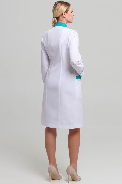 Спинка - с вертикальными рельефами, выходящими из плечевых швов. Горловина халата оформлена воротником-стойкой контрастного цвета. Застёжка - центральная, бортовая, на обмётанные петли и пуговицы.
