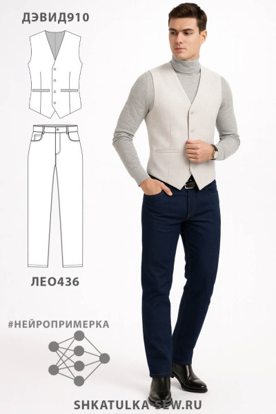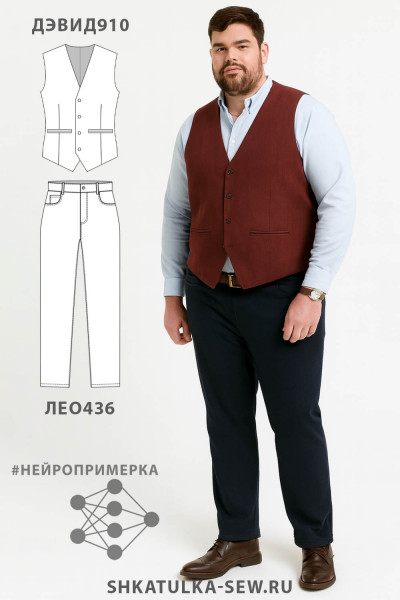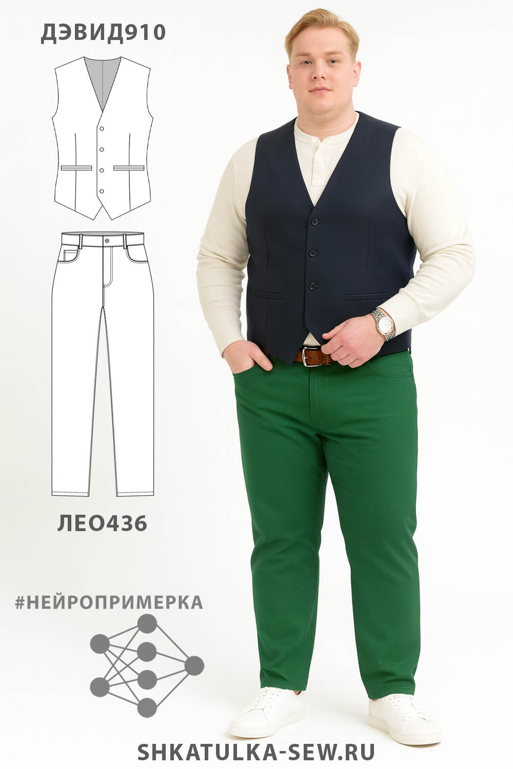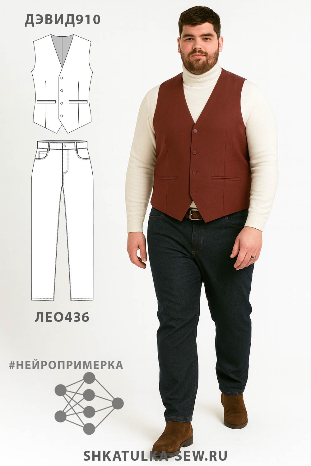 10Параметры модели: рост 183 см, обхват груди 102 см , обхват талии 87 см, обхват бедер 109 см. Выбрана выкройка 52 размера, рост 178-183 см. Выкройка скорректирована (уменьшена) в талии по параметрам модели.