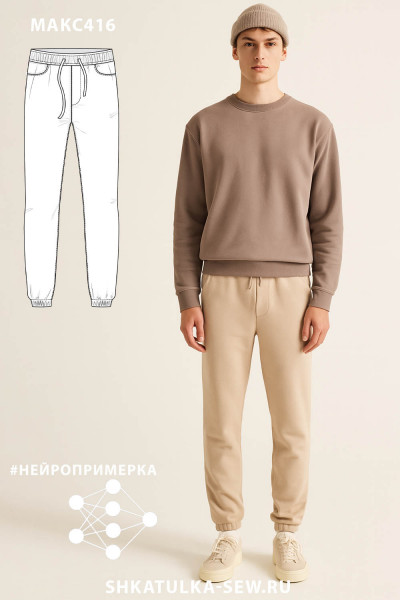 4Выкройка мужских джинсов на резинке прилегающего силуэта. Объем малый. Застежки нет. Спереди располагаются карманы с отрезным бочком, ложный гульфик. На задних половинках - отрезная кокетка и накладные карманы. В нижней части брюк - цельнокроеная манжета с резинкой.