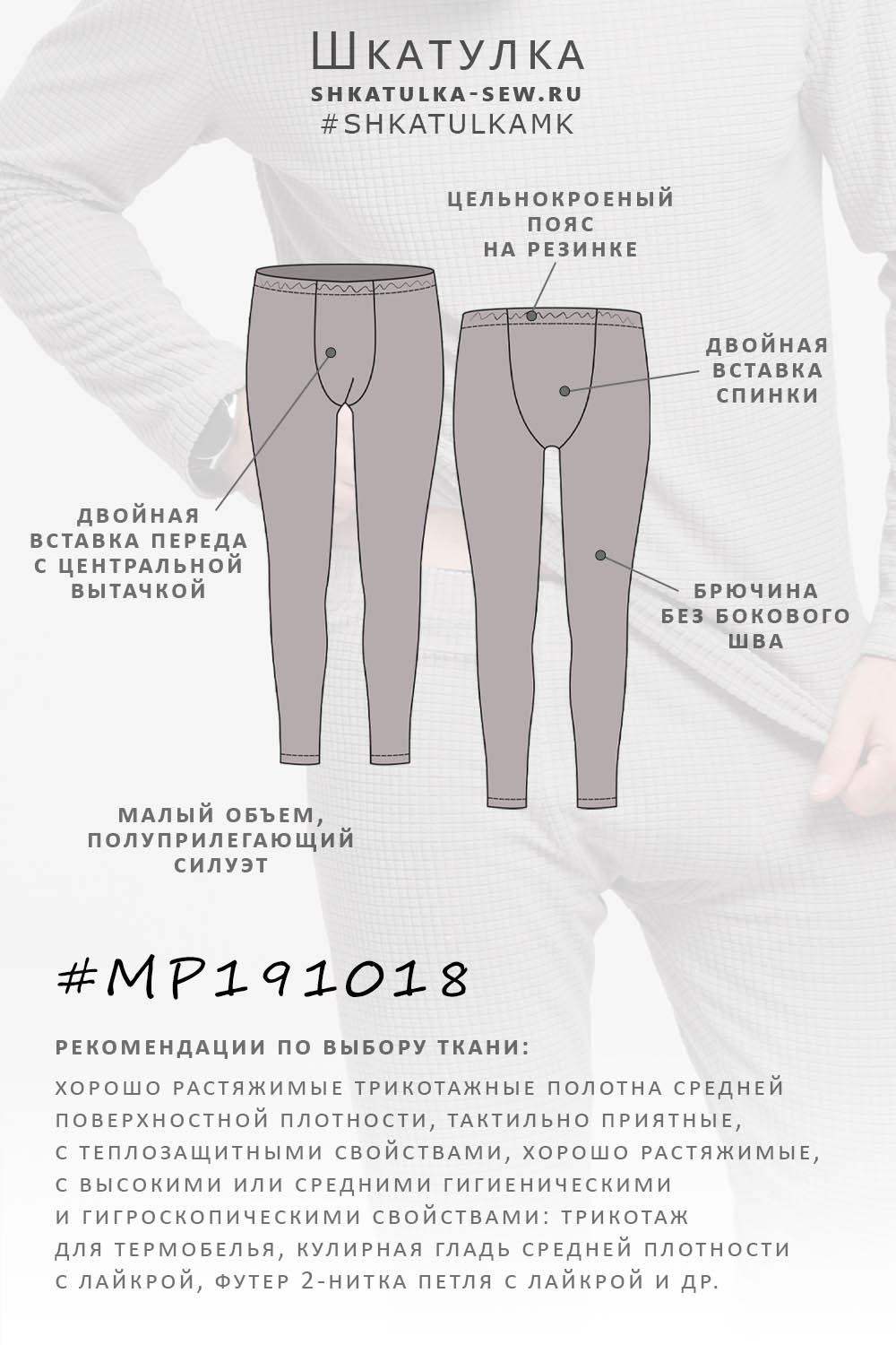 DESCRIPTION_LONG Выкройка мужских трикотажных кальсон малого объёма, полуприлегающего силуэта. Кальсоны состоят из основной детали (брючина без бокового шва), двойной вставки переда с центральной вытачкой в нижней части, и двойной вставки спинки.
