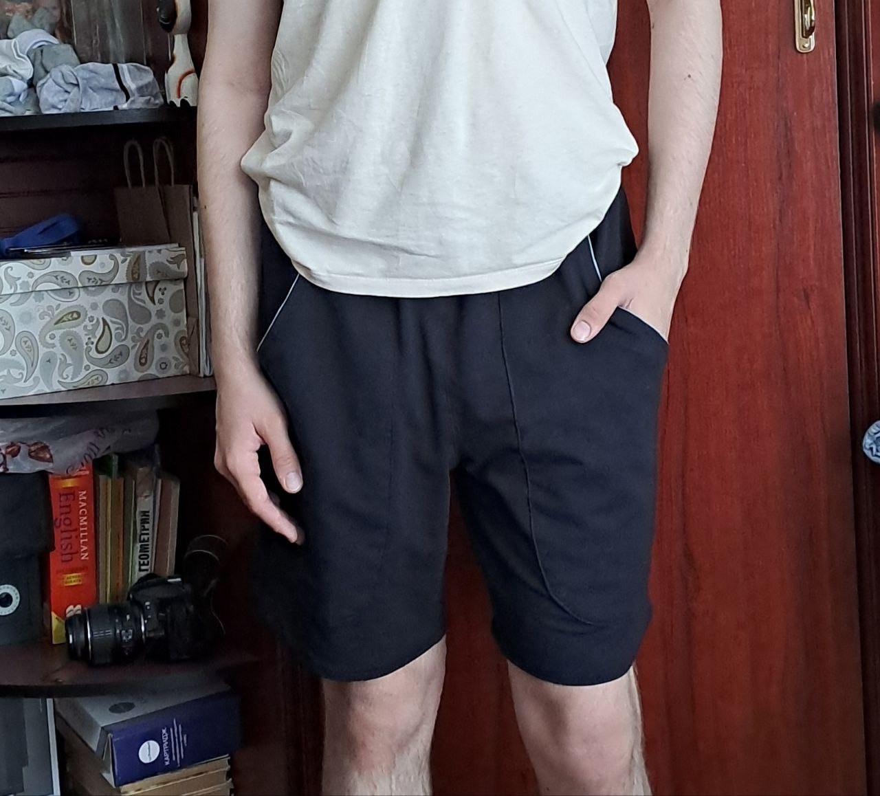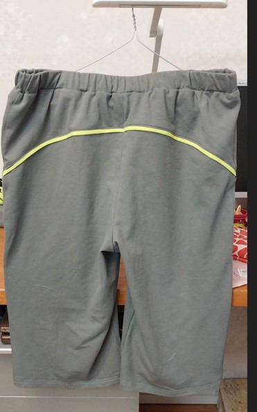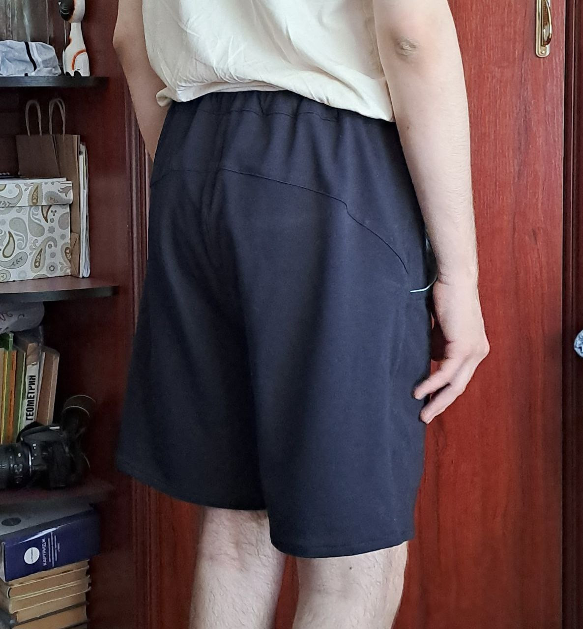 4Выкройка мужских шорт прямого силуэта, среднего объёма. Пояс шорт — притачной, на резинке. На передних половинках шорт расположены глубокие фигурные накладные карманы, обработанные контрастной подкладкой, переходящей в узкий отделочный кант по краю входа в карман. На задних половинках предусмотрены фигурные кокетки. Длина шорт — выше колена.