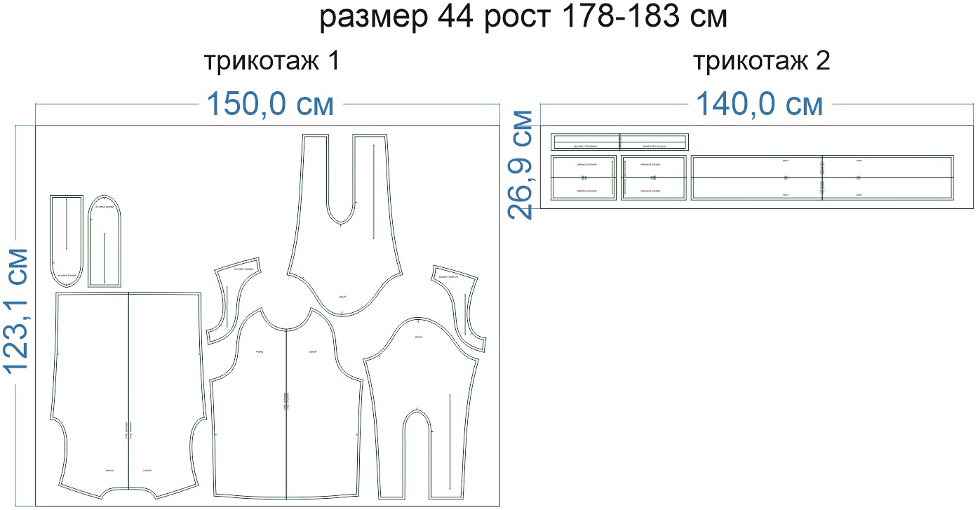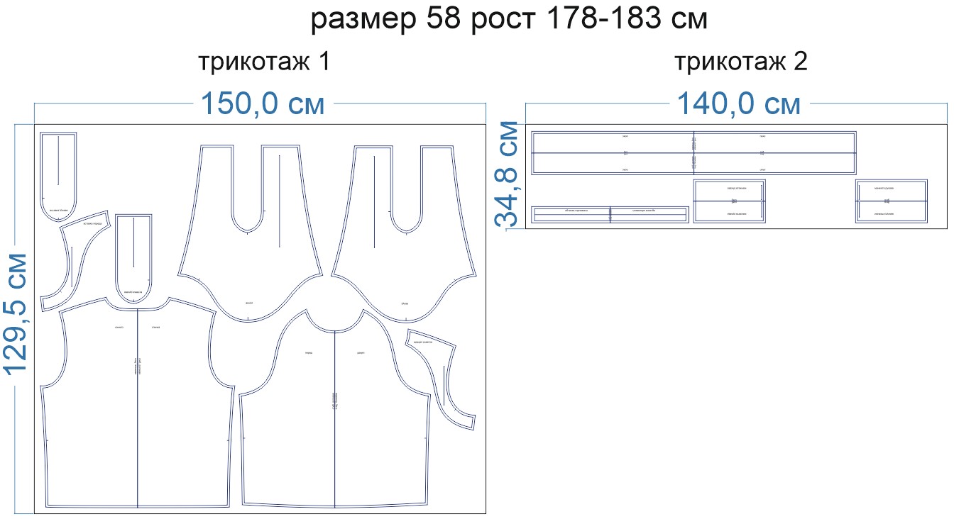 Образцы раскладки на трикотаже для выборочных размеров (расчет выполнен для однотонного трикотажа одного цвета без учета направления ворса):