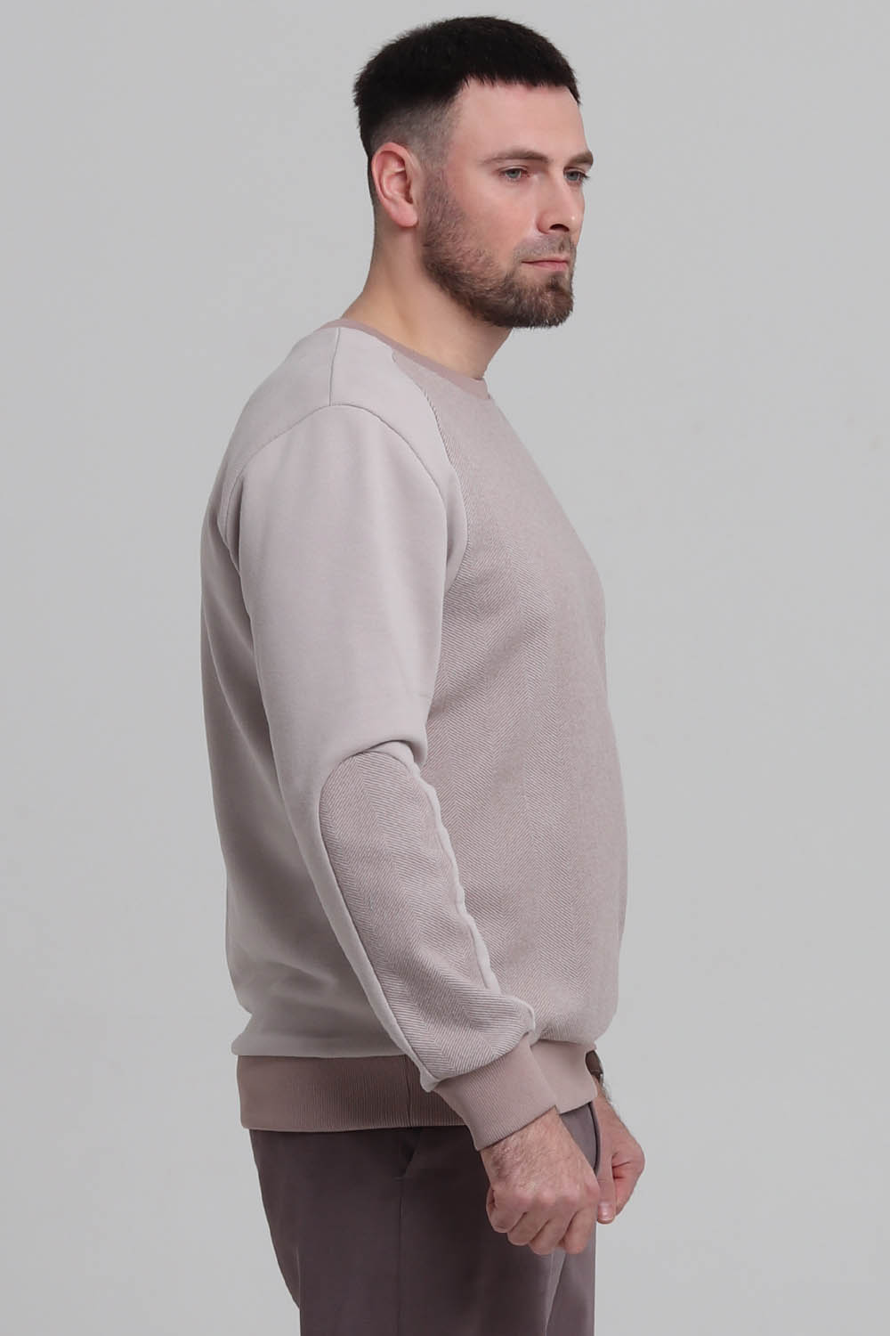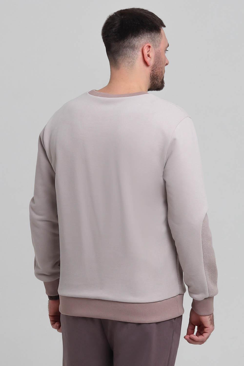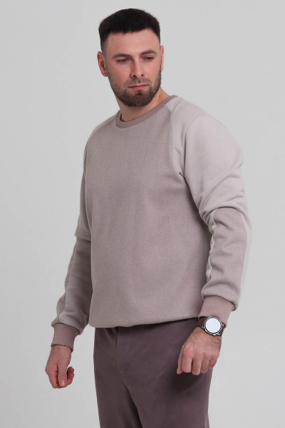 Выкройка мужского трикотажного свитшота умеренного объёма, прямого силуэта, выполненного из трикотажа двух видов. Перед с фигурными кокетками. Спинка - цельная, без формообразующих конструктивных элементов. Горловина - круглой формы, обработана трикотажной обтачкой. Рукава со вставками, втачные, длинные, по низу на трикотажной манжете. По низу свитшота предусмотрен круговой трикотажный пояс. Длина изделия - до линии бёдер. Перед и вставки рукавов выполнены из трикотажа одного вида. Кокетки переда, спинка и рукава выполнены из трикотажа второго вида.