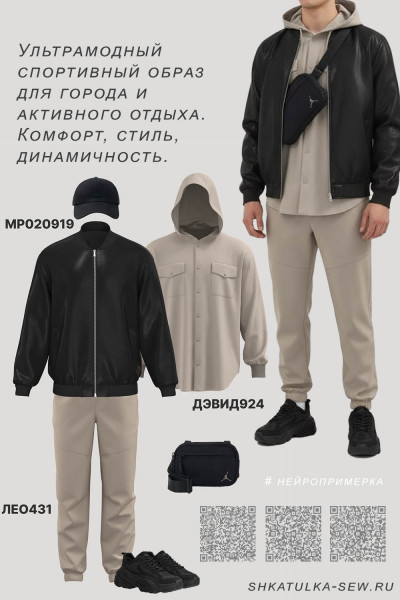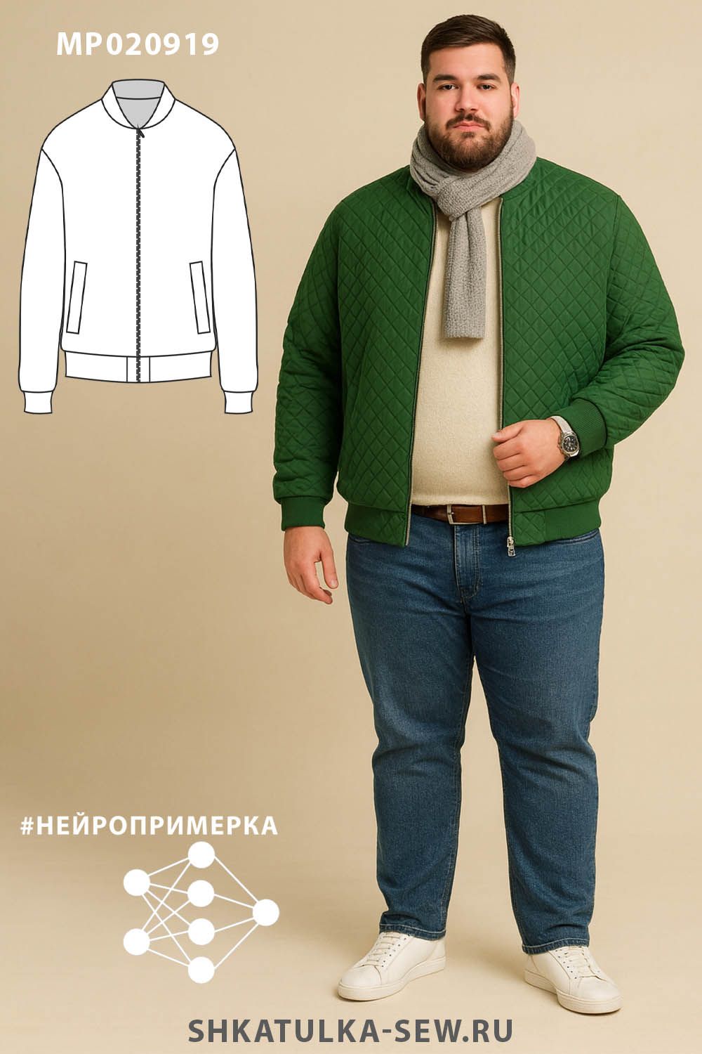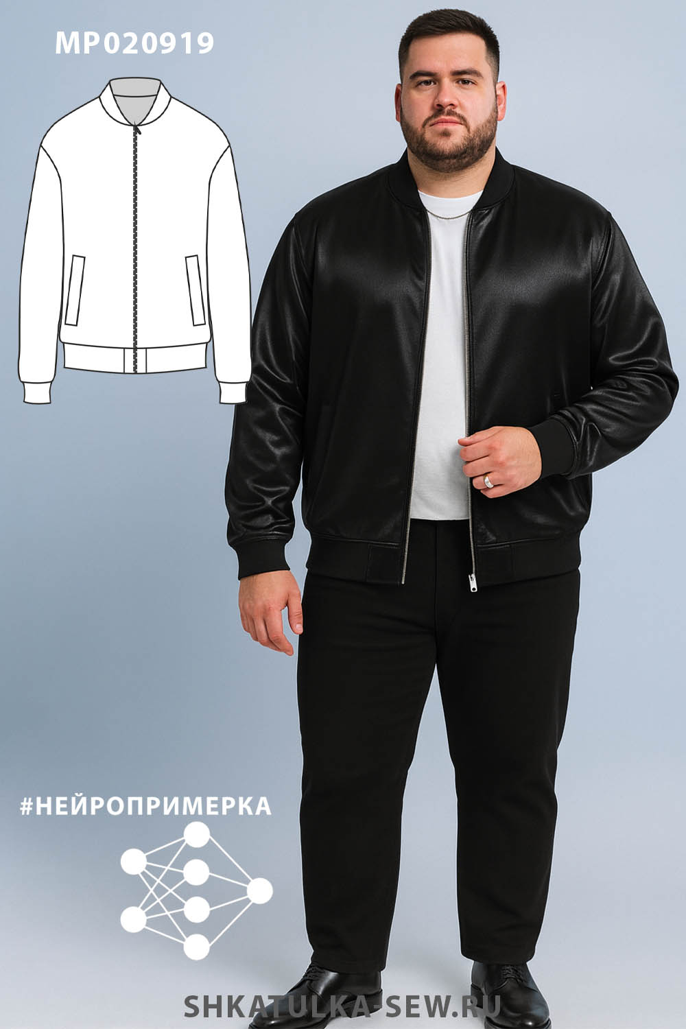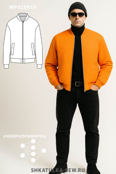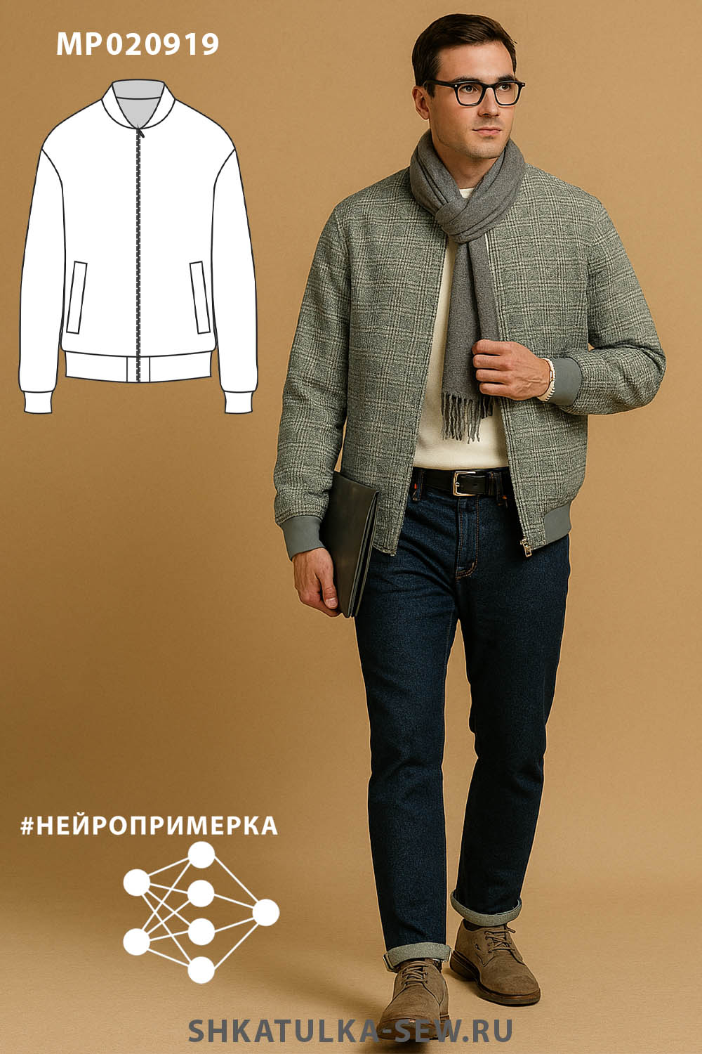 Выкройка мужской куртки-бомбера среднего объёма, прямого силуэта. Может использоваться в качестве выкройки куртки унисекс. Перед — с боковыми, диагонально ориентированными прорезными карманами с листочками. Спинка — цельная, без особенностей. Застёжка — центральная, на разъёмную молнию. Горловина куртки обработана трикотажным воротником-стойкой. Рукава — рубашечного покроя, длинные, с трикотажной манжетой по низу. По низу куртки предусмотрен трикотажный пояс со вставками из основного материала, расположенными по центру внизу переда.