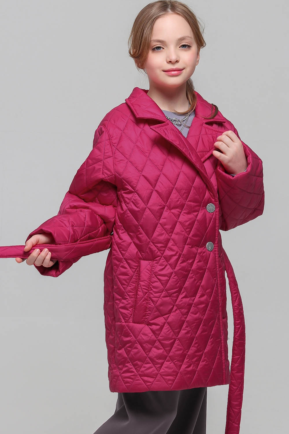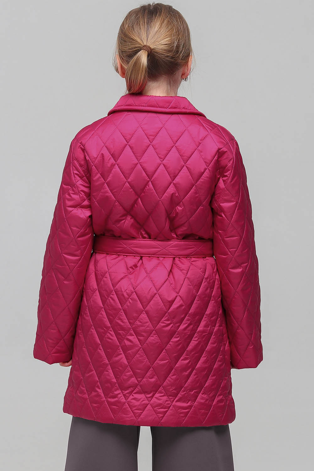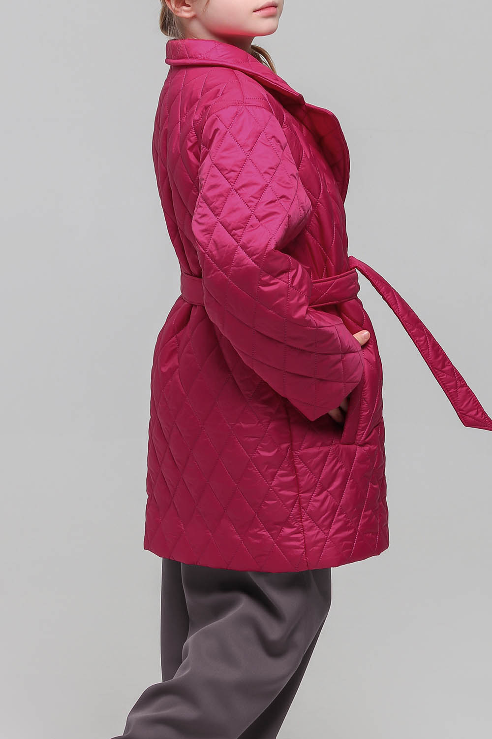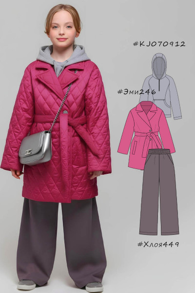 4Выкройка детского утеплённого пальто среднего объёма, прямого силуэта, с удлиненной линией плеча, выполненного на притачной подкладке. Детали переда - с боковыми прорезными карманами с листочками с втачными концами. Спинка - цельная, без формообразующих конструктивных элементов. Горловина обработана отложным воротником английского типа с лацканами. Застёжка - центральная, двубортная, на обмётанные петли и пуговицы. Рукава - рубашечного покроя, среднего объёма, длинные. В качестве дополнения к пальто предусмотрен съёмный завязывающийся пояс. Длина пальто - выше колен.