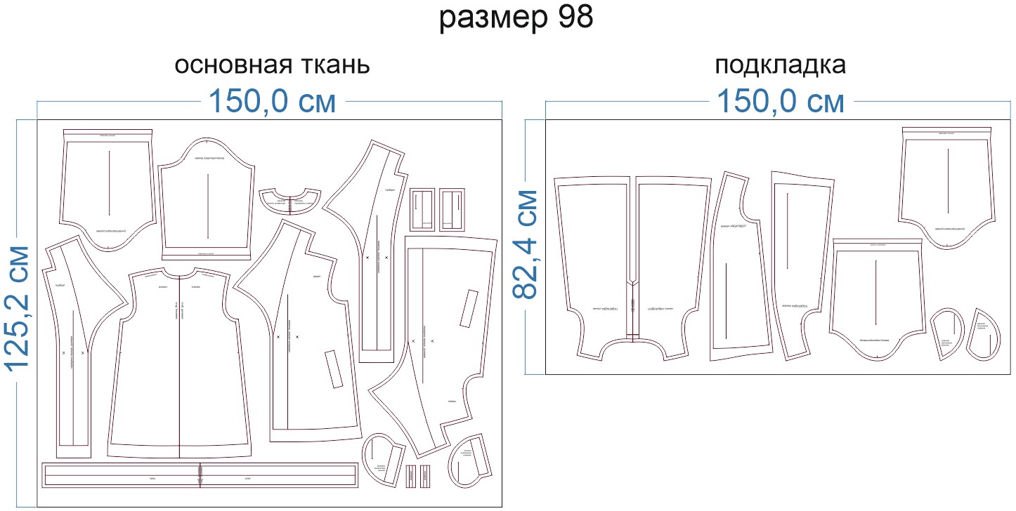 Внимание: расчет выполнен для однотонной ткани без рисунка, без учета направления ворса и возможной усадки! Усадка может достигать 15-20% от длины материала. Обязательно учитывайте это и берите с запасом.