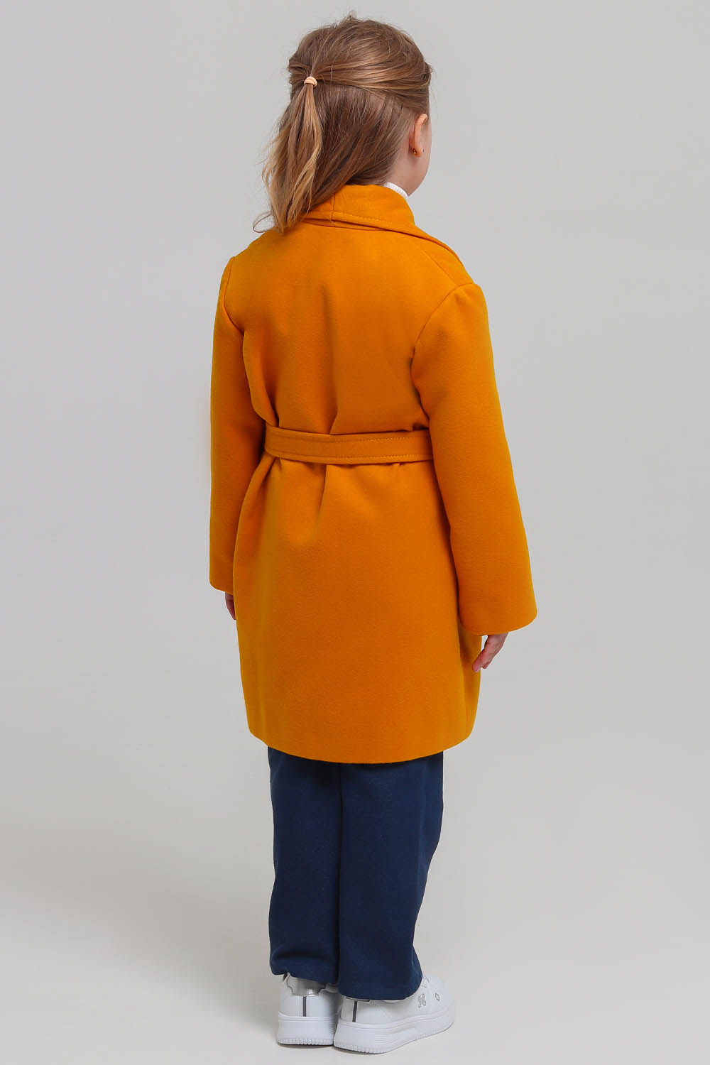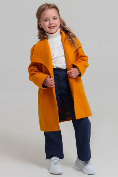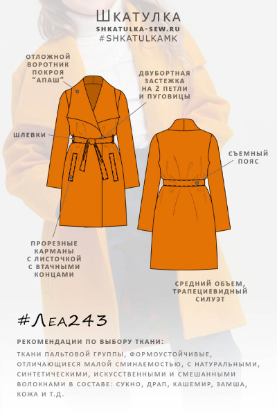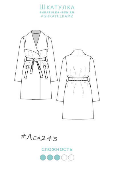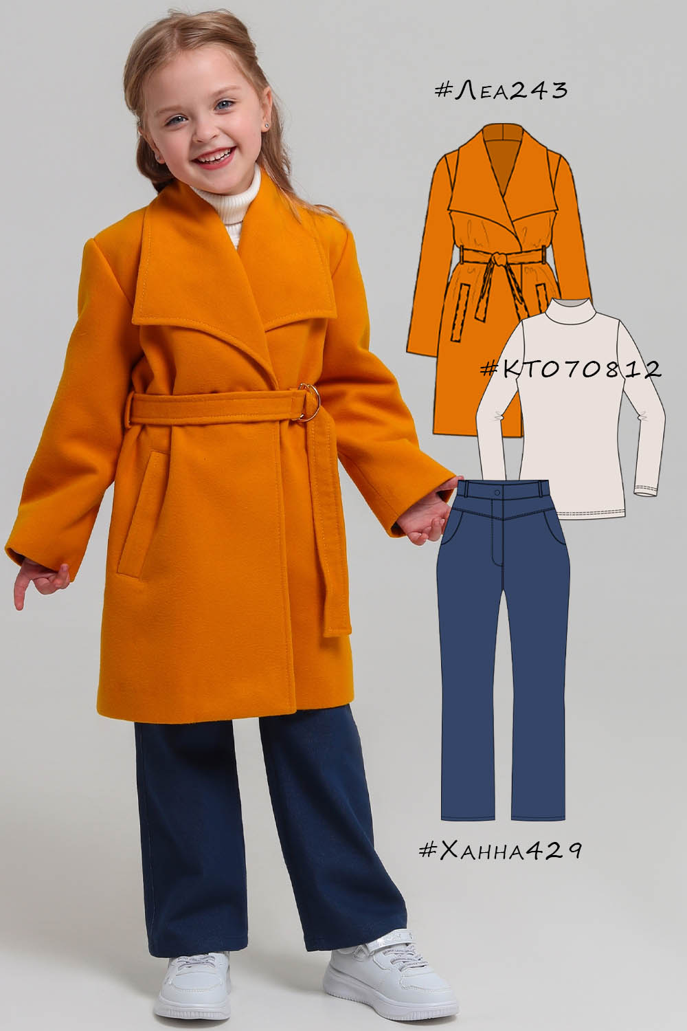 4Выкройка детского пальто среднего объёма, трапециевидного силуэта, выполнено на подкладке. Перед - с боковыми прорезными карманами с листочкой с втачными концами. Спинка - цельная, без формообразующих конструктивных элементов. Застёжка - центральная, двубортная, на 2 обмётанных петли и пуговицы. Горловина оформлена отложным воротником покроя "апаш". Рукава - втачные, длинные. В качестве дополнения к пальто предусмотрен съёмный пояс с полукольцами, позволяющий формировать силуэт изделия. По боковым швам пальто в области талии предусмотрены шлёвки под пояс.