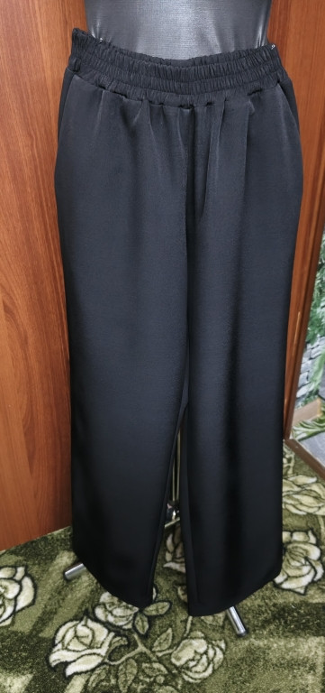 Выкройка женских пижамных брюк умеренного объёма, прямого силуэта. Передние и задние половинки — цельные, без особенностей. Верхний срез брюк обработан цельнокроеным поясом на резинке. Длина брючин — до щиколотки.