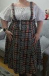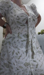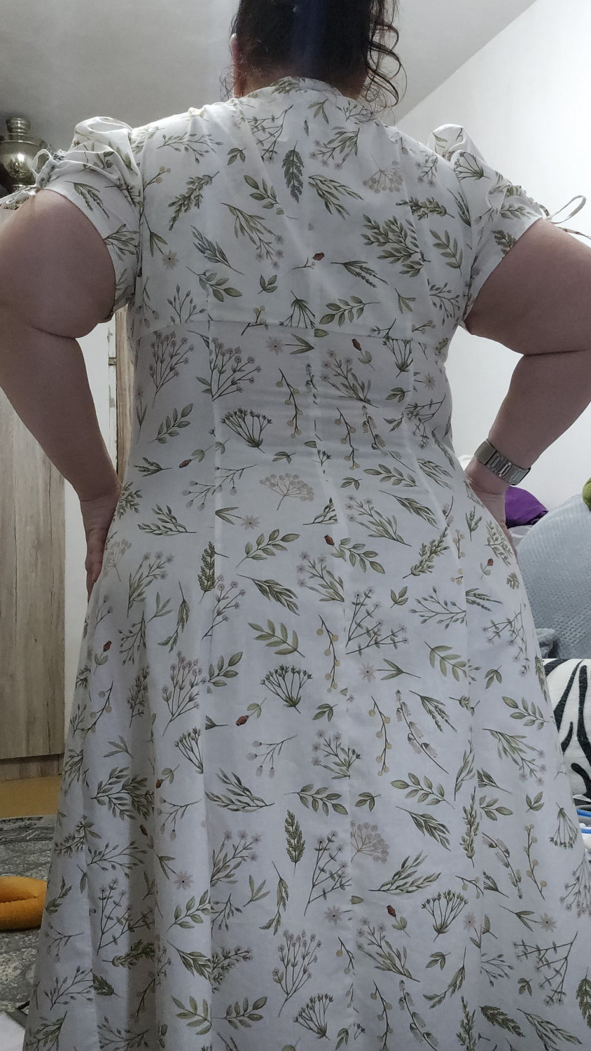 Спинка состоит из двойной верхней части со средним швом, плечевыми и талиевыми вытачками, нижней центральной части со средним швом, и нижних боковых частей. Застёжка платья — комбинированная: на цельнокроеные завязки в верхней части переда и на обмётанные петли и пуговицы в нижней части переда. Рукава платья втачные, длиной выше локтя. По окату рукавов предусмотрена сборка. По низу рукавов предусмотрен фигурный вырез с кулиской и завязкой. Длина платья — ниже колен.