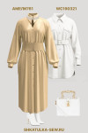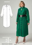 4Выкройка женского платья-рубашки среднего объёма, прямого силуэта. Перед — с нагрудными вытачками, выходящими из боковых швов. Спинка — цельная. Горловина платья частично обработана цельнокроеными подбортами и отложным воротником рубашечного типа на отрезной стойке. Застёжка — центральная, бортовая, на обмётанные петли и пуговицы по борту и на обмётанную петлю и пуговицу на воротнике. Рукав — реглан с плечевой вытачкой, длинный, со сборкой, разрезом и притачной застёгивающейся манжетой по низу. В боковых швах платья предусмотрены карманы. Форма низа платья — фигурная. Длина платья — миди (ниже колен). Это платье предполагается носить с готовым широким ремнем.