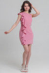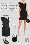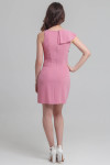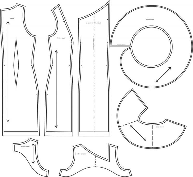 4Выкройка женского асимметричного платья малого объёма, прилегающего силуэта. Перед - с вертикальными рельефами, выходящими из плечевых швов. В правом рельефе переда втачан широкий волан, переходящий в волан на спинке. Спинка - со средним швом и талиевыми вытачками. Горловина платья по переду имеет асимметричную форму, по спинке - круглую. Горловина и проймы платья обработаны цельнокроеной подкройной обтачкой. Застёжка - потайная молния - расположена в среднем шве спинки. Длина платья - до середины бедра.