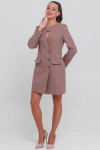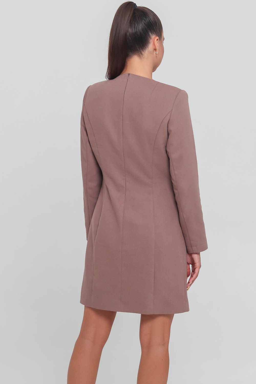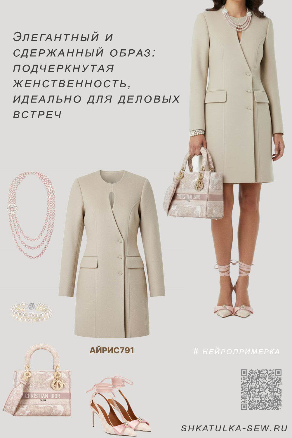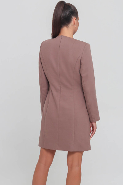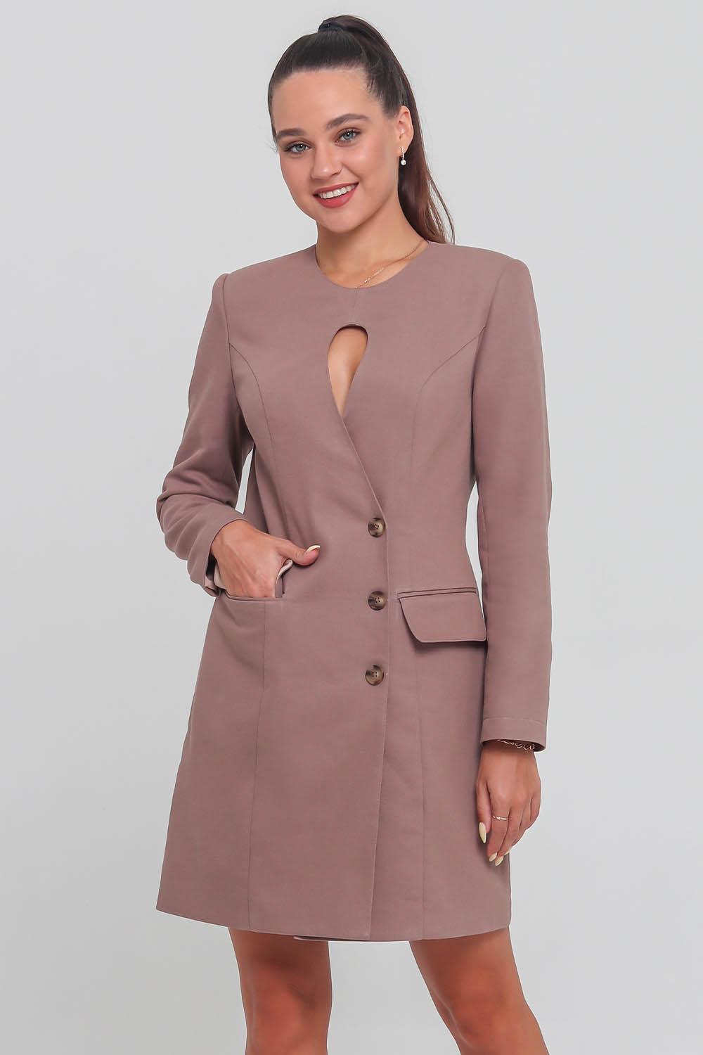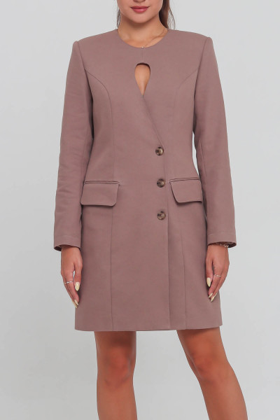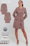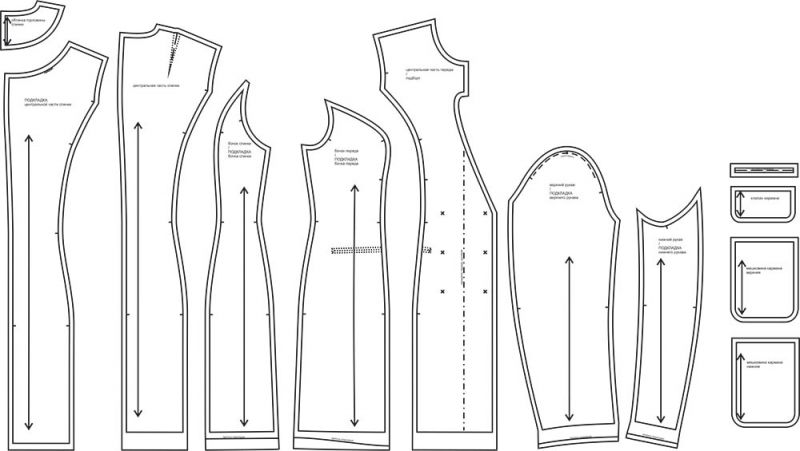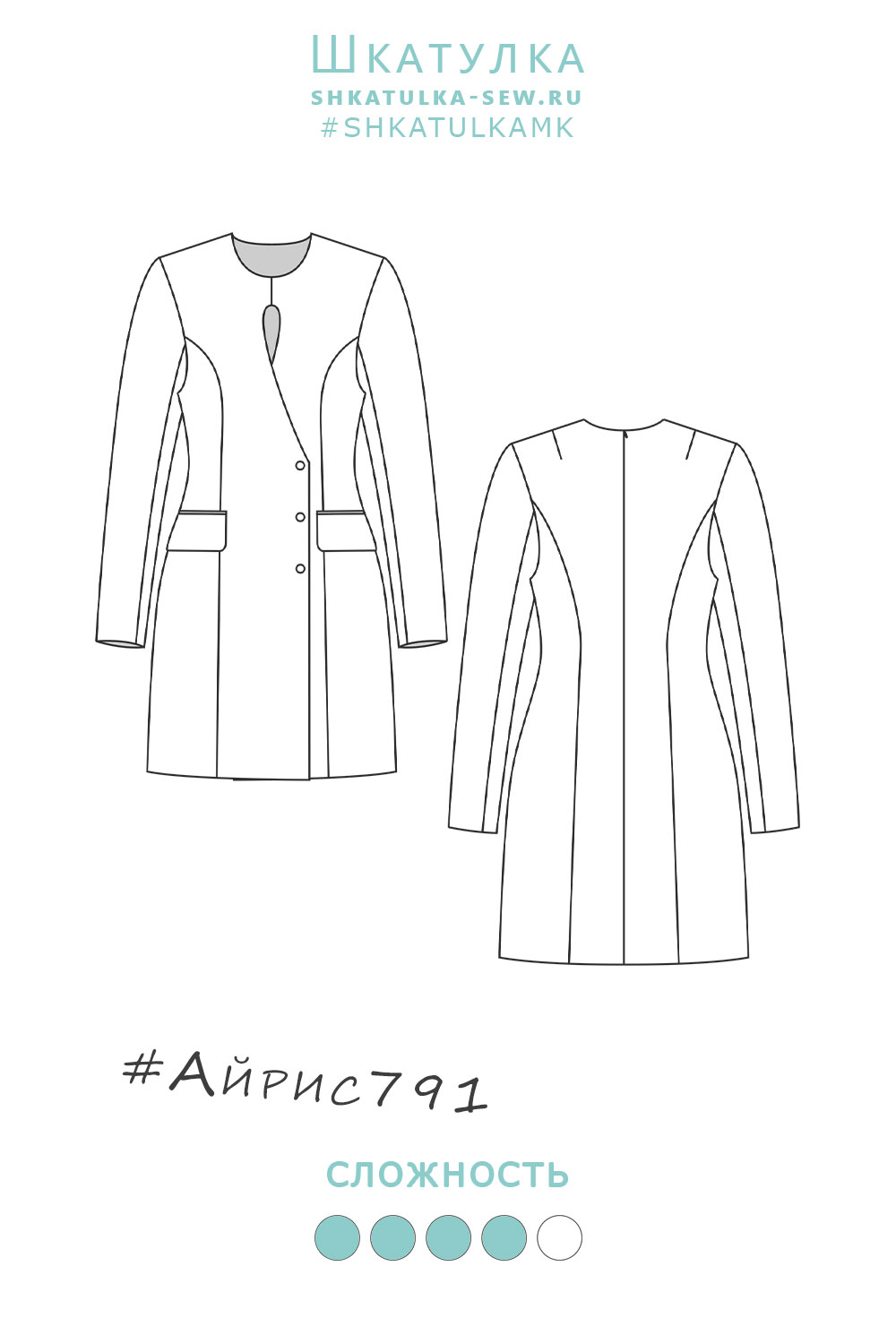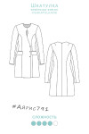 4Выкройка женского платья-жакета среднего объёма, полуприлегающего силуэта, выполненного на подкладке. Перед состоит из центральных частей и бочков. Центральные части переда соединены между собой по среднему шву в области горловины. Ниже горловины центральные части переда образуют глубокий вырез в форме перевёрнутой капли и далее переходят в декоративную двубортную застёжку с пришитыми насквозь пуговицами. По бокам переда, посередине между линиями талии и бёдер, предусмотрены горизонтальные боковые прорезные карманы с клапанами и обтачками. Спинка платья-жакета состоит из центральных частей с плечевыми вытачками и бочков. Горловина жакета имеет круглую форму, обработана подбортами и подкройными обтачками. Застёжка - потайная молния - расположена в среднем шве спинки. Рукава втачные, двухшовные, длинные.
