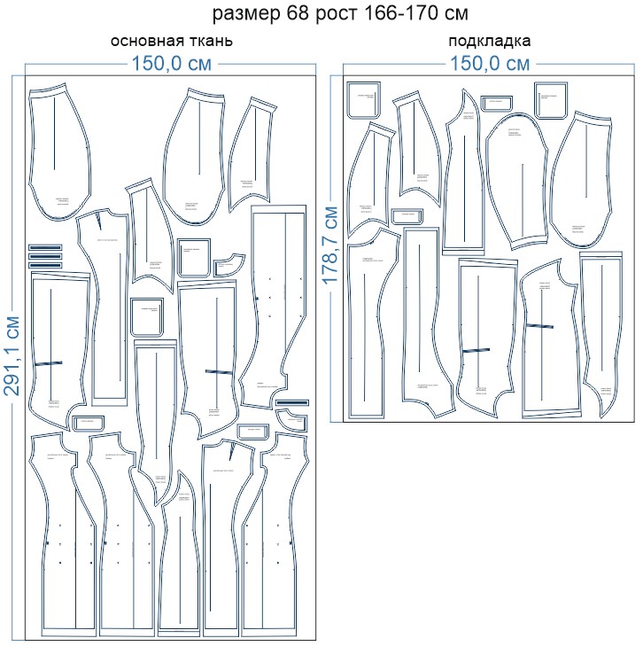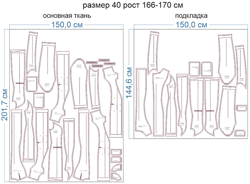 Образцы раскладки на ткани для выборочных размеров (расчет выполнен для однотонной ткани без учета направления ворса):