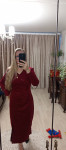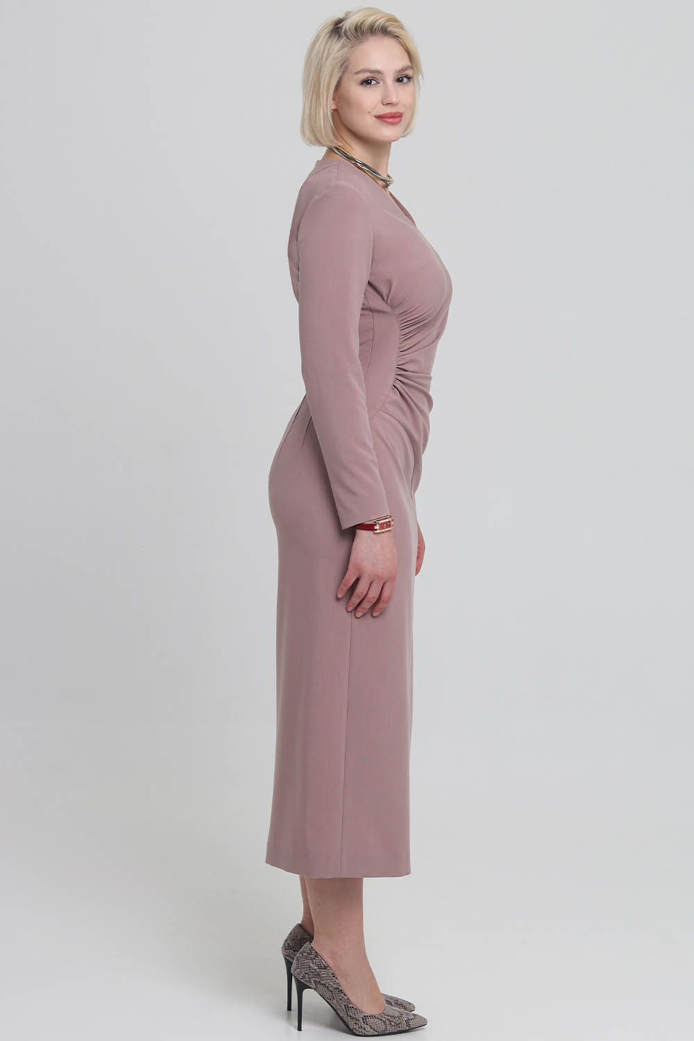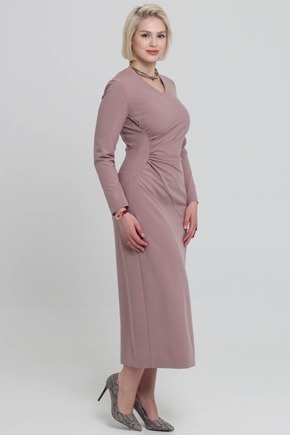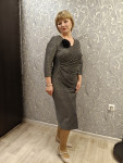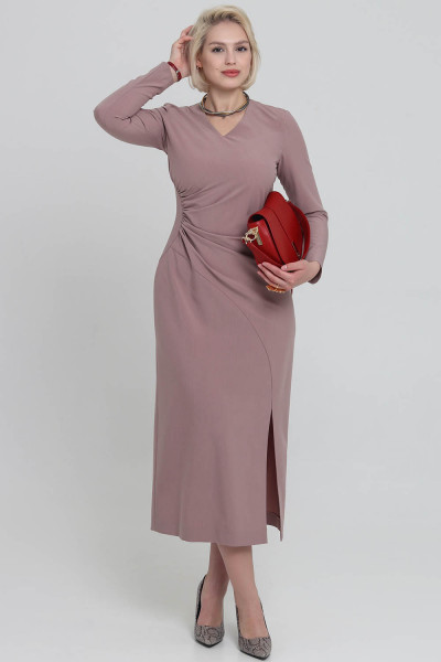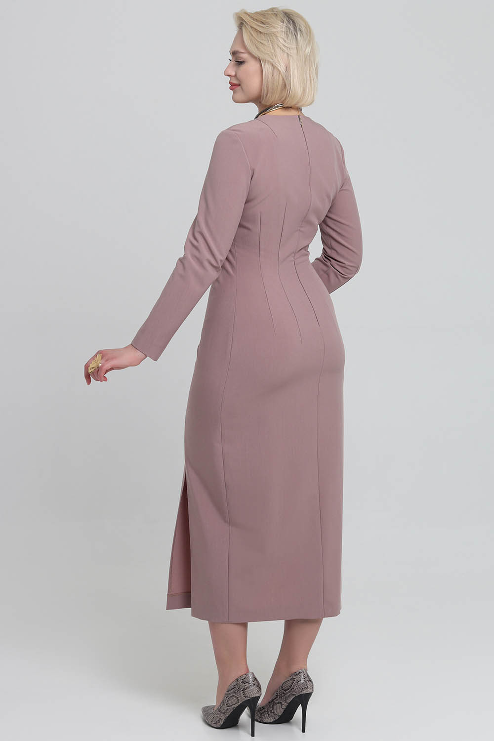 4Выкройка женского платья малого объёма, полуприлегающего силуэта. Перед состоит из основной детали, нижней части переда и бочка. Основная деталь присборена по шву притачивания бочка. По низу шва стачивания основной и нижней деталей переда предусмотрен разрез, обеспечивающий свободу шага. Спинка - со средним швом, плечевыми вытачками и двойными талиевыми вытачками. Горловина платья - V-образной формы, обработана подкройными обтачками. Застёжка - потайная молния в среднем шве спинки. Рукава - втачные, одношовные, с локтевой вытачкой, длиной до запястья. Длина платья - до середины икр.