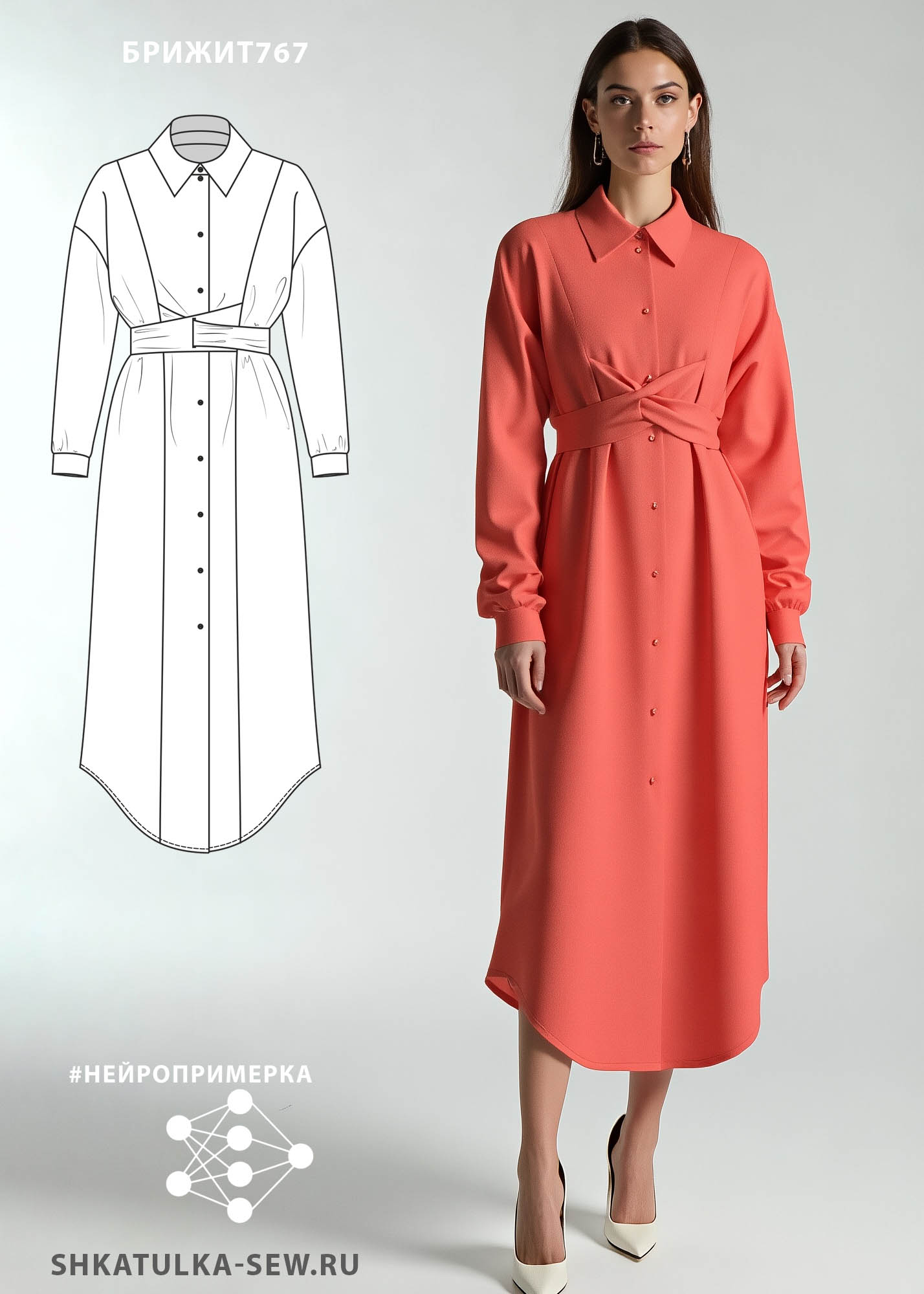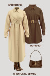 4Выкройка женского платья среднего объёма полуприлегающего силуэта, со спущенной линией плеча. Перед — с вертикальными рельефами, выходящими из плечевых швов. В рельефах на уровне талии предусмотрены завязки, позволяющие регулировать степень прилегания платья по талии. Спинка — цельная, без особенностей. Горловина платья обработана отложным рубашечным воротником на отрезной стойке. Застёжка платья — центральная, на цельнокроеные планки, обмётанные петли и пуговицы. Рукава — рубашечного покроя, длинные, с разрезом и защипами по низу, на притачной застёгивающейся манжете. Длина платья — до середины икр. Форма низа переда и спинки платья — фигурная.