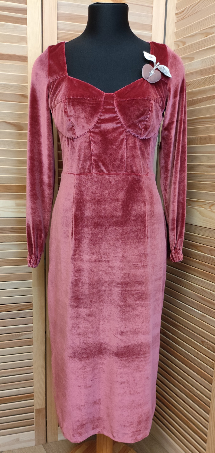 Выкройка платья прилегающего силуэта, отрезного по линии талии, с фигурным декольте с Т-образными чашками, длина миди (ниже колен). На полочке располагаются вертикальные рельефы под грудью. На спинке - вертикальные рельефы. Верхняя часть платья обработана подкладкой. На юбке платья расположены по 2 талиевых вытачки спереди и сзади. По среднему шву спинки предусмотрена длинная шлица.