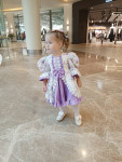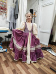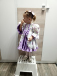 4Выкройка детского нарядного платья с завышенной талией. Длина ниже колен. Лиф прилегающий, укороченный. Нижняя часть платья сильно расклешена, со сборкой по верхнему краю и с широкой оборкой по нижнему краю. Горловина круглая. Рукава короткие, объемные, со сборкой по окату и резинкой по низу. В боковые швы втачаны детали пояса-завязки. Застежка в среднем шве спинки на потайную молнию. Платье на подкладке.
