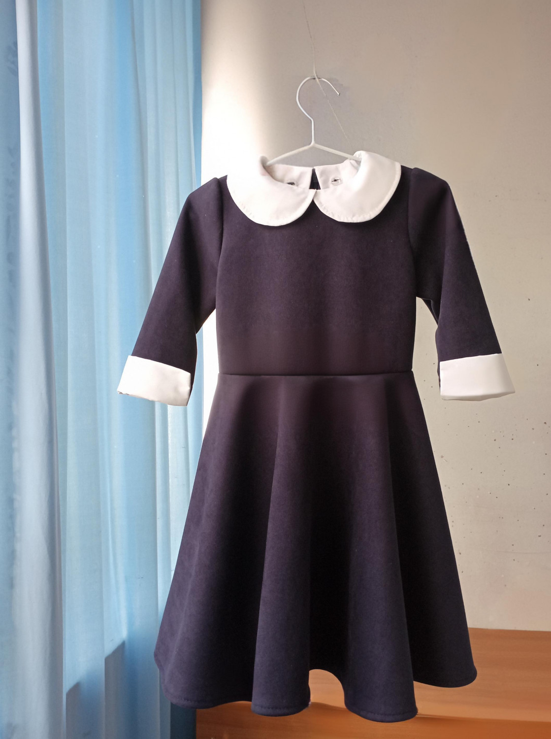 Горловина платья имеет круглую форму. Застёжка платья — длинная потайная молния в среднем шве спинки, переходящая в средний шов юбки.