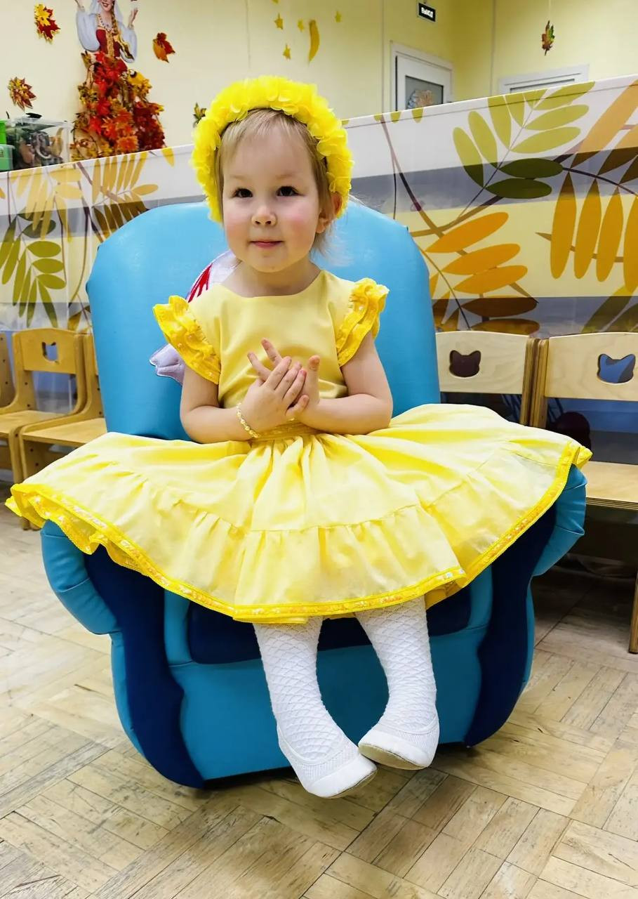Длина платья — до колена. В качестве дополнения к платью предусмотрен съёмный завязывающийся пояс из контрастной ткани, а также подъюбник на резинке. Для большего объема юбки можно сшить 2 подъюбника.