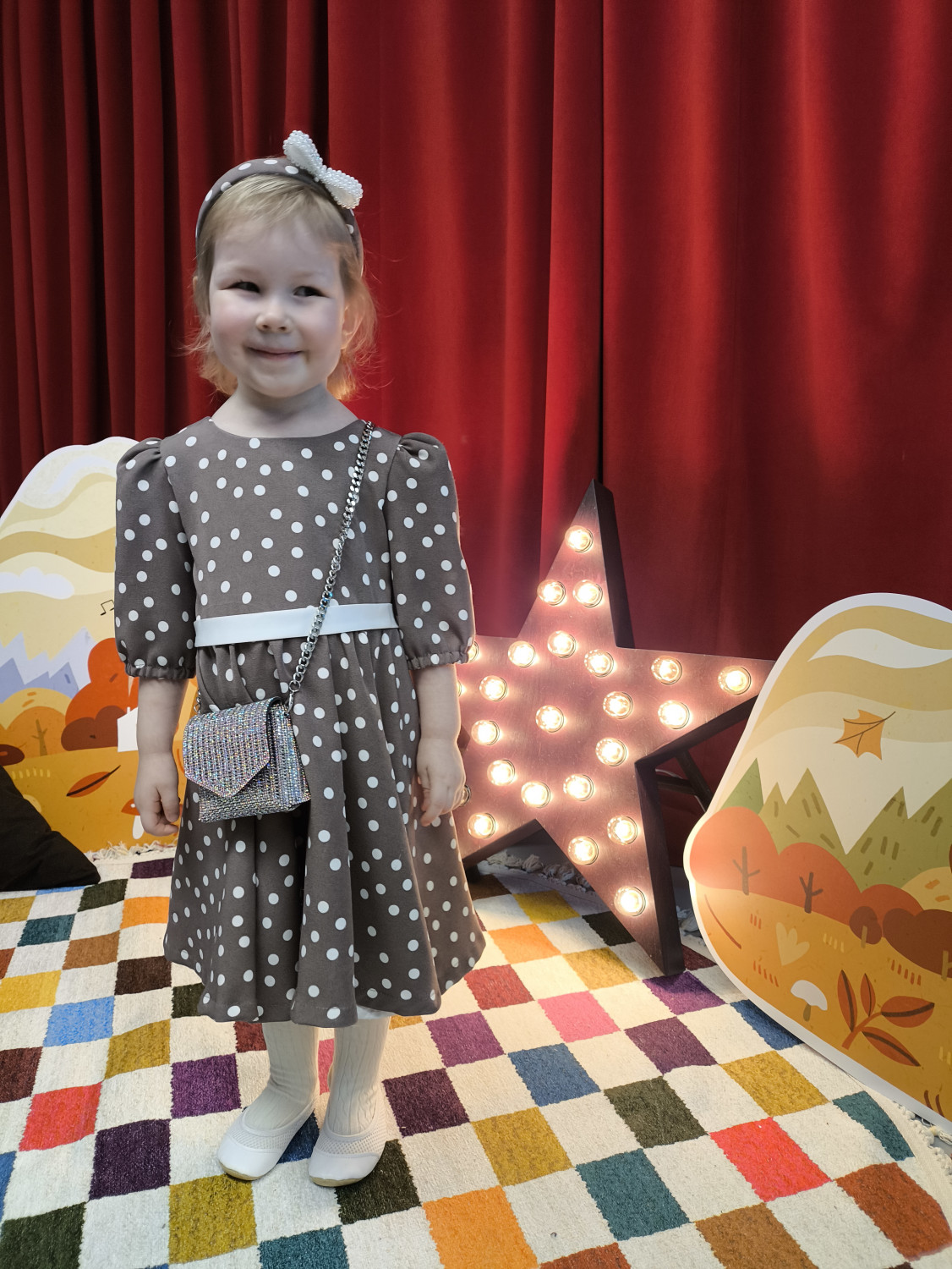 10Параметры модели: рост 118 см, обхват груди 59 см , обхват талии 55 см, обхват бедер 63 см . Выбрана выкройка 116 размера. Корректировки не выполнялись.