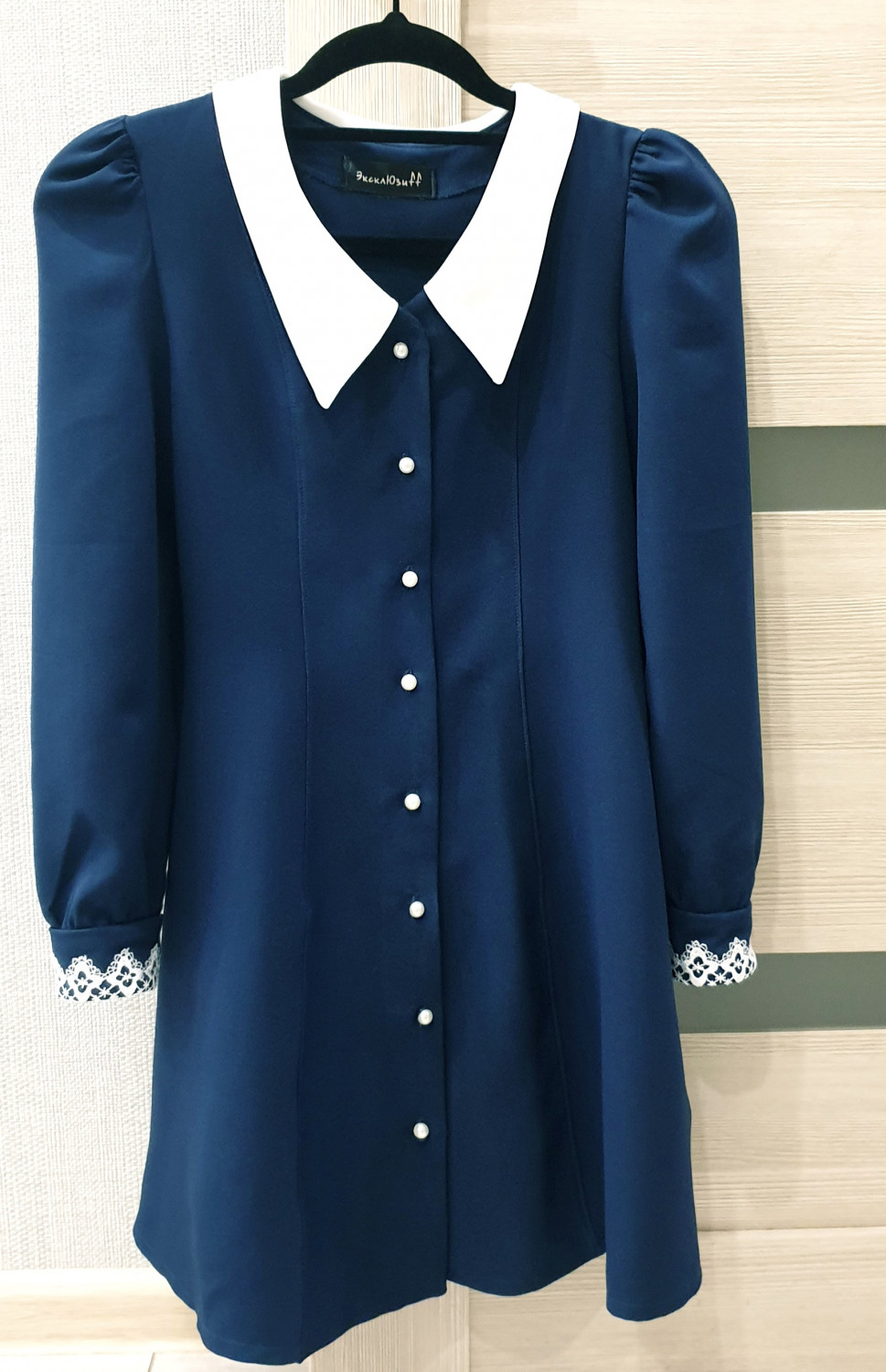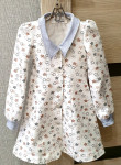 4Выкройка детского платья умеренного объёма, А-силуэта. Перед — с вертикальными рельефами, выходящими из плечевых швов. Спинка - с вертикальными рельефами, выходящими из плечевых швов, со шнуровкой в области талии. Горловина платья углублена по переду, имеет V-образную форму, оформлена отложным воротником из отделочной ткани. Застёжка — центральная, бортовая, на обмётанные петли и пуговицы. Рукава — втачные, длинные, со сборкой по окату, с разрезом и сборкой по низу, на притачной застёгивающейся манжете. Длина платья — выше колена.